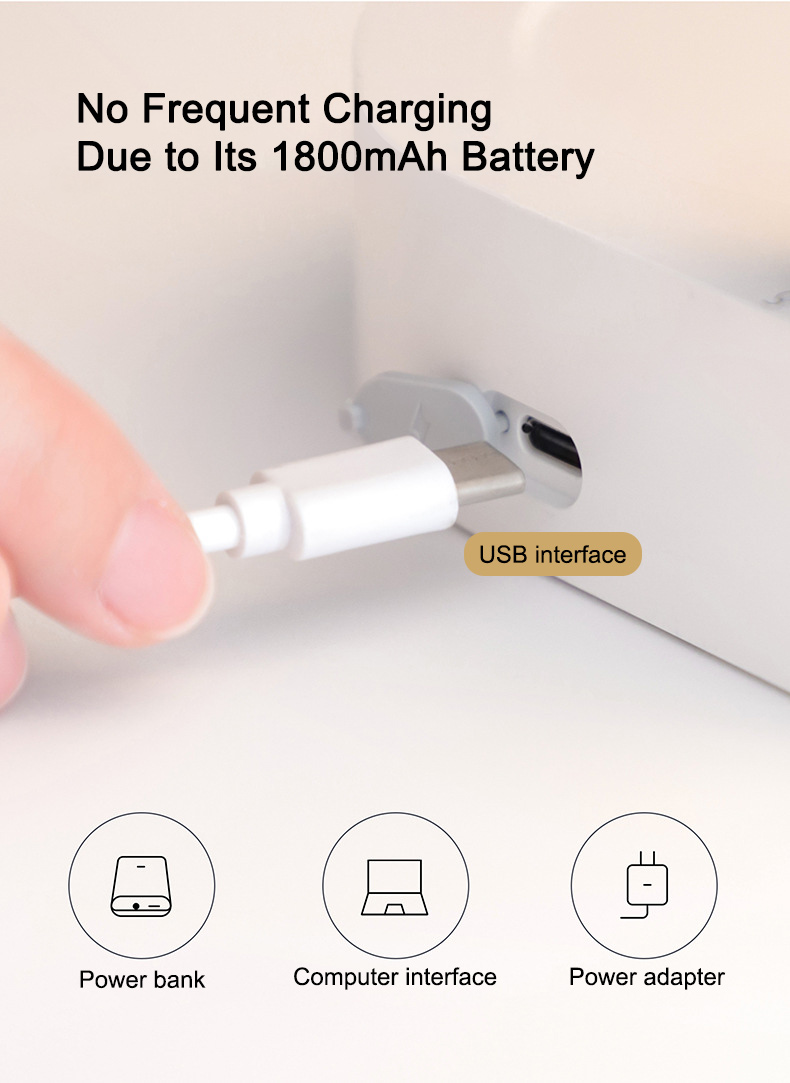 - Super Long Endurance Time: No need to charge it frequently thanks to its built-in 1800mAh battery and its USB interface. It can by charged by power banks, computer interfaces and power adapters.