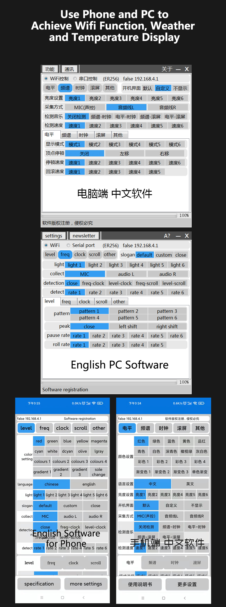 3.4. Level-Scrolling Mode: it will automatically display the scrolling screen when there is no music; when there is music, it will display the level. (Attention: If you want to fix a certain mode, please turn off the detection first. Long press the MENU button on the machine, and press the mute button on the remote control.)