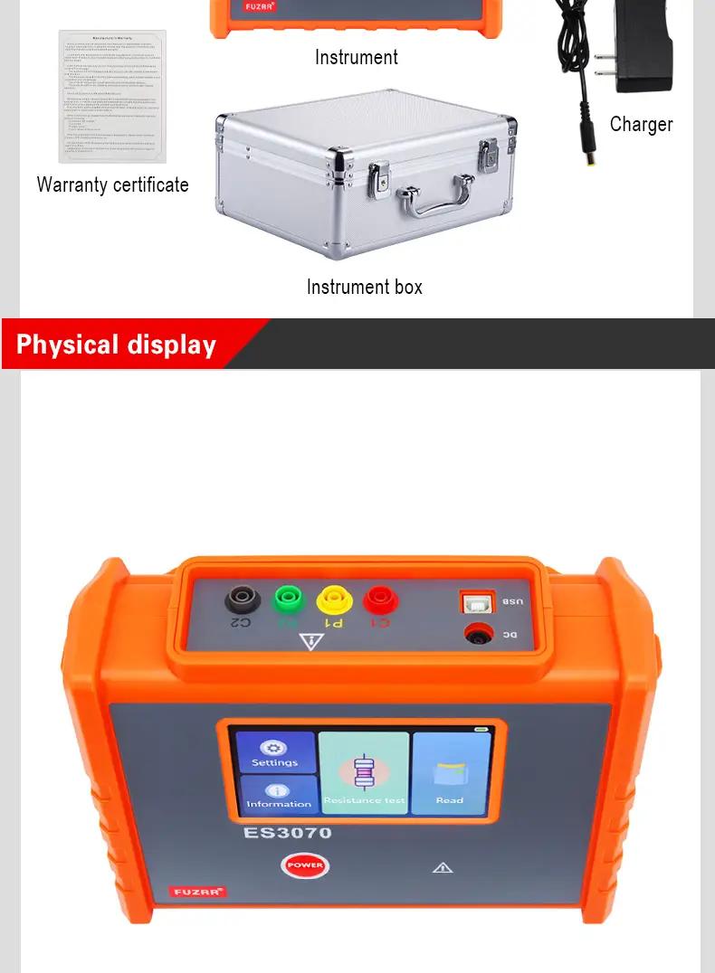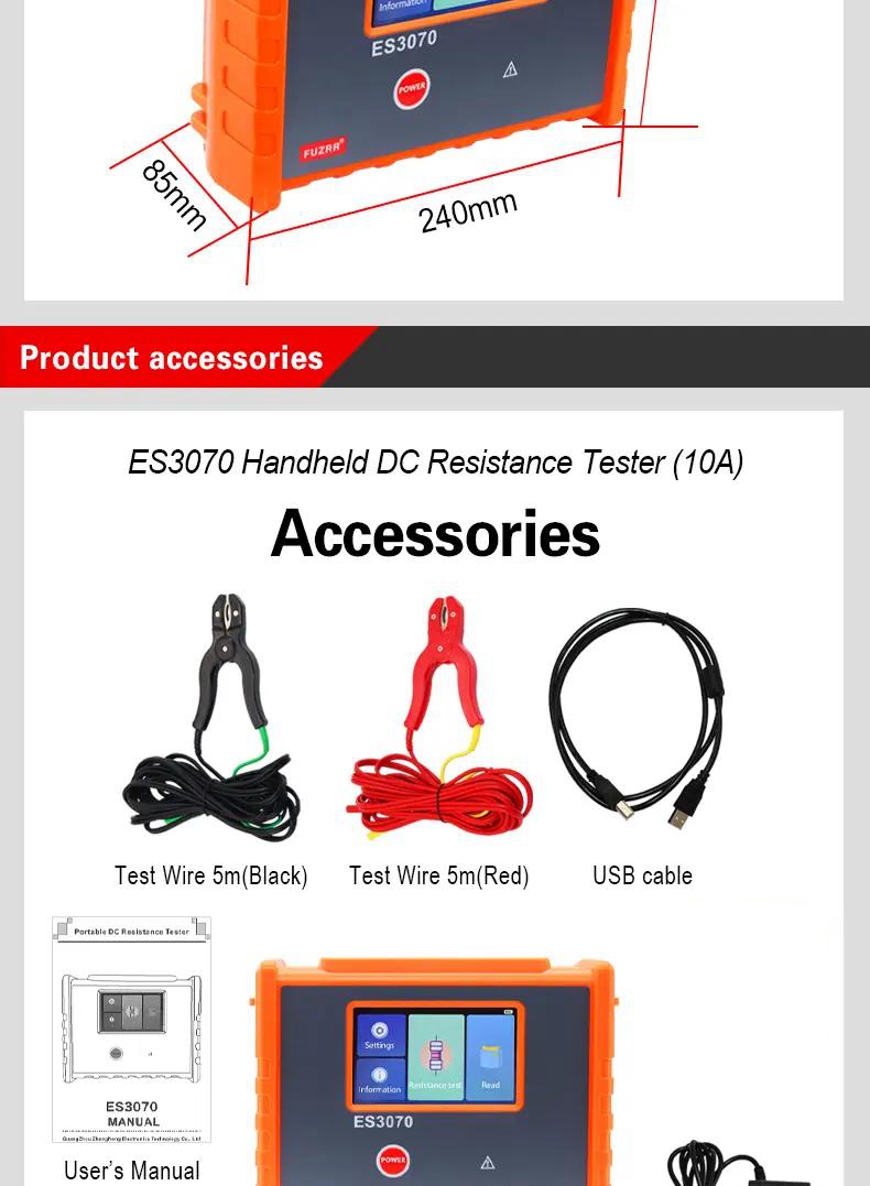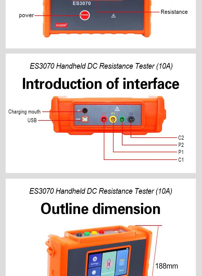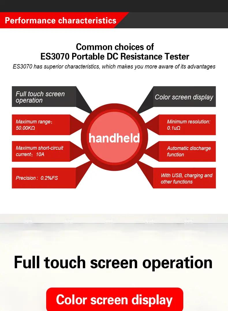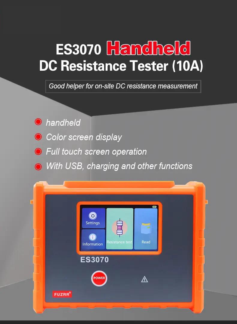 - ES3070 Portable DC Resistance Tester is composed of a host, monitoring software, test line and communication line.Host handheld portable design is convenient for field application, with charging function without on-site power search, full-color large LCD display, clear at a glance, easy to use touch screen operation, port overload protection function. Large capacity storage 500 groups of data, resistance measurement range: 10.0uΩ to 50.00KΩ, measuring accuracy: ±0.2%FS±10dgt. The upper computer software has the functions of reading, consulting, saving and reporting historical data.
