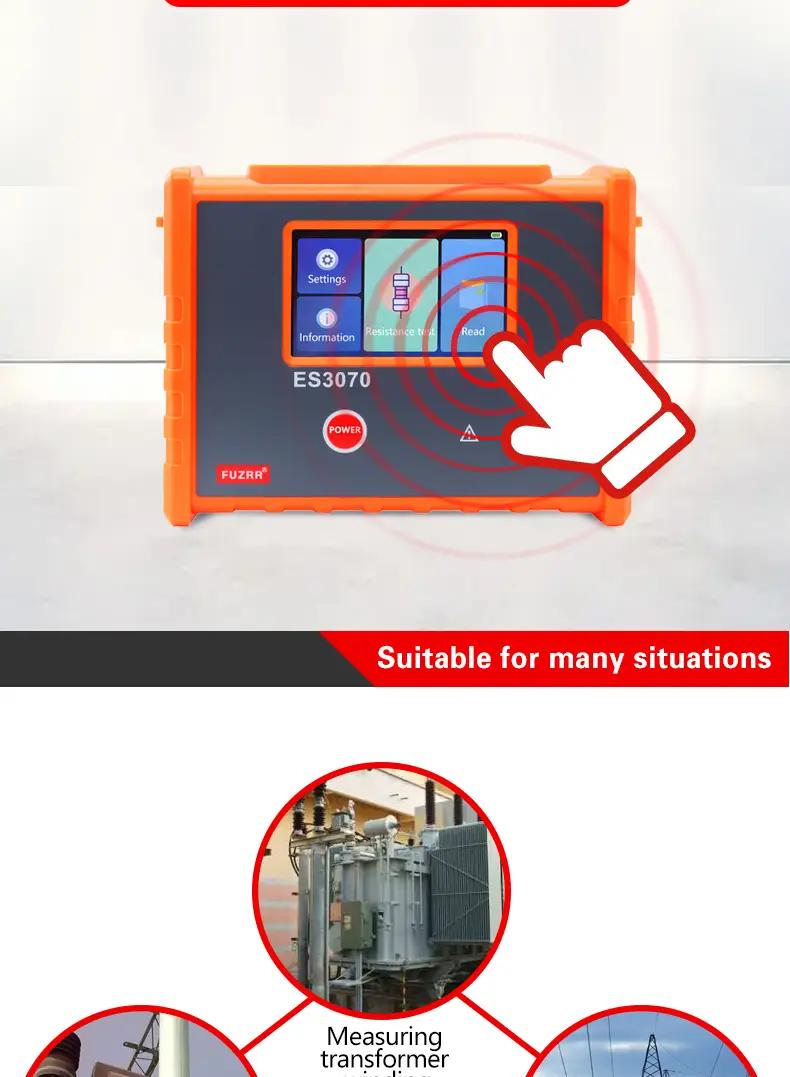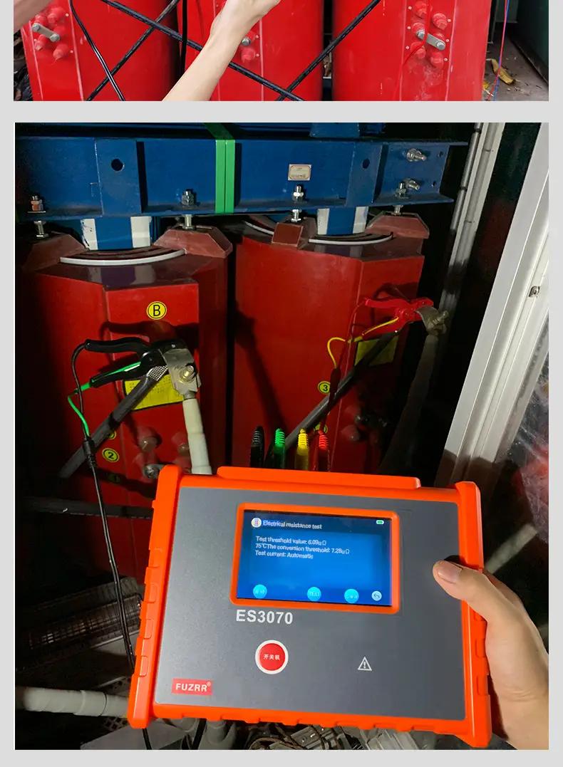 - ES3070 Portable DC Resistance Tester, also known as transformer DC resistance tester, DC resistance rapid tester, grounding conductivity tester, adopts microprocessor technology, four-wire test, safe, precise and reliable. It is mainly used for measurement of transformer winding resistance, transformer winding resistance, ground down lead conduction testing, the wire resistance of the cable, switch, socket, relay contact resistance, winding, motor, shell and equipment, lightning protection zone, ground beam, structure, rack, steel, pipe, Windows, fence, radiator, pipeline connection between objects such as metal components resistance test. It is widely used in telecommunication, electric power, meteorology, machine room, oil field, electric power distribution line, tower transmission line, gas station, factory grounding grid, lightning rod and so on.