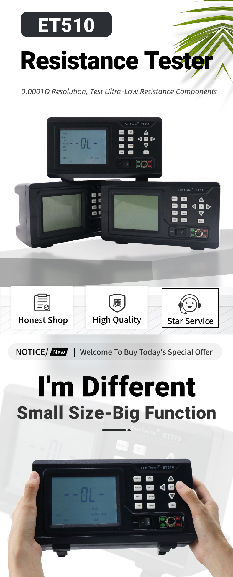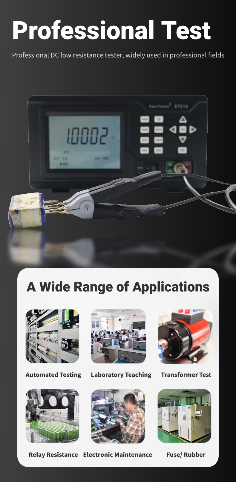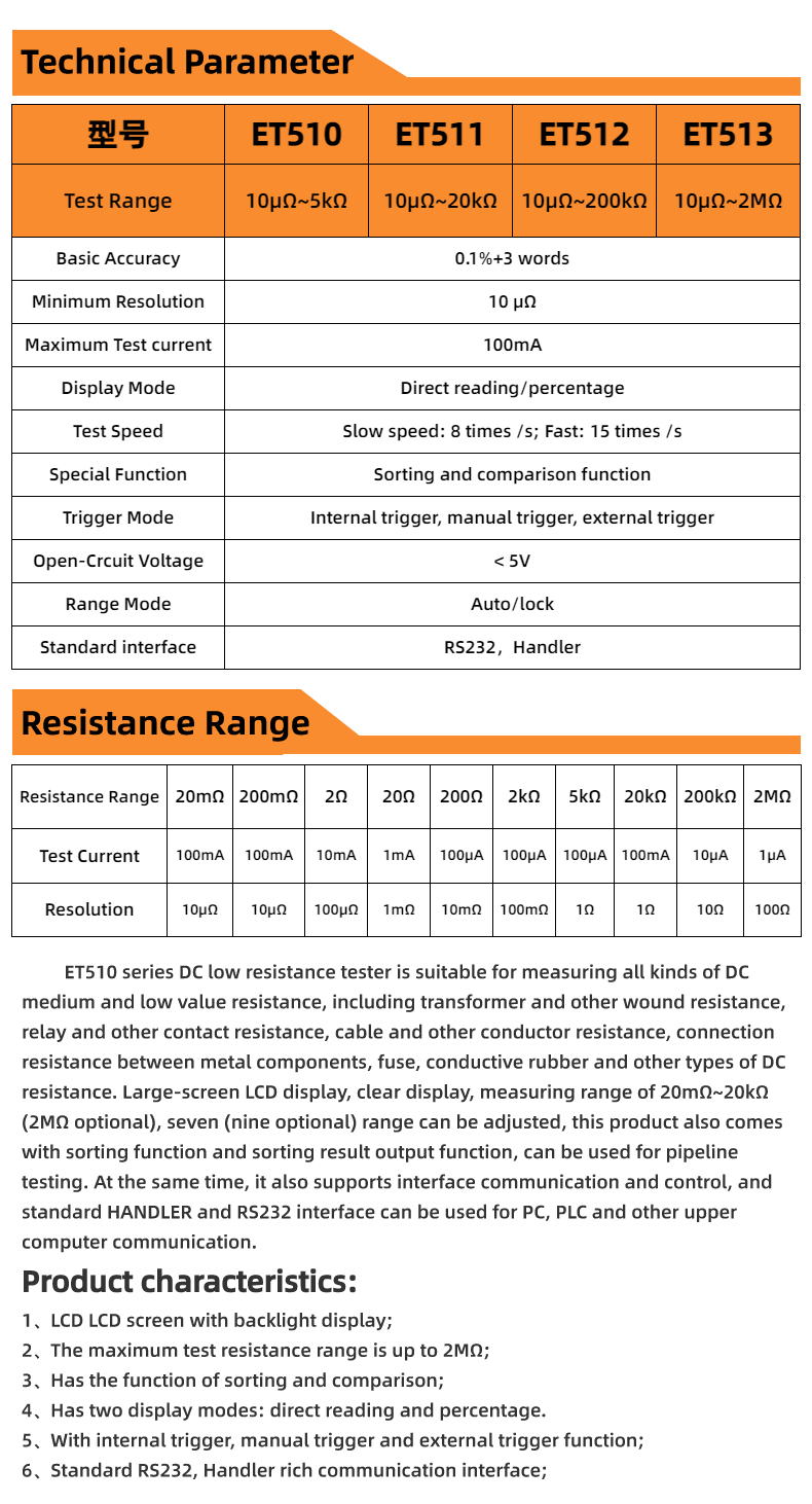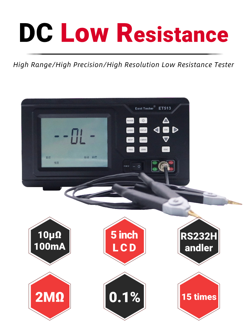 - ET51X series DC low resistance tester is suitable for measuring all kinds of DC medium and low value resistance, including transformer and other wound resistance, relay and other contact resistance, cable and other conductor resistance, connection resistance between metal components, fuse, conductive rubber and other types of DC resistance. Large-screen LCD display, clear display, measuring range of 20mΩ ~ 20kΩ (2MΩ optional), seven (nine optional) range can be adjusted, this product also comes with sorting function and sorting result output function, can be used for pipeline testing. At the same time, it also supports interface communication and control, and standard HANDLER and RS232 interface can be used for PC, PLC and other upper computer communication.