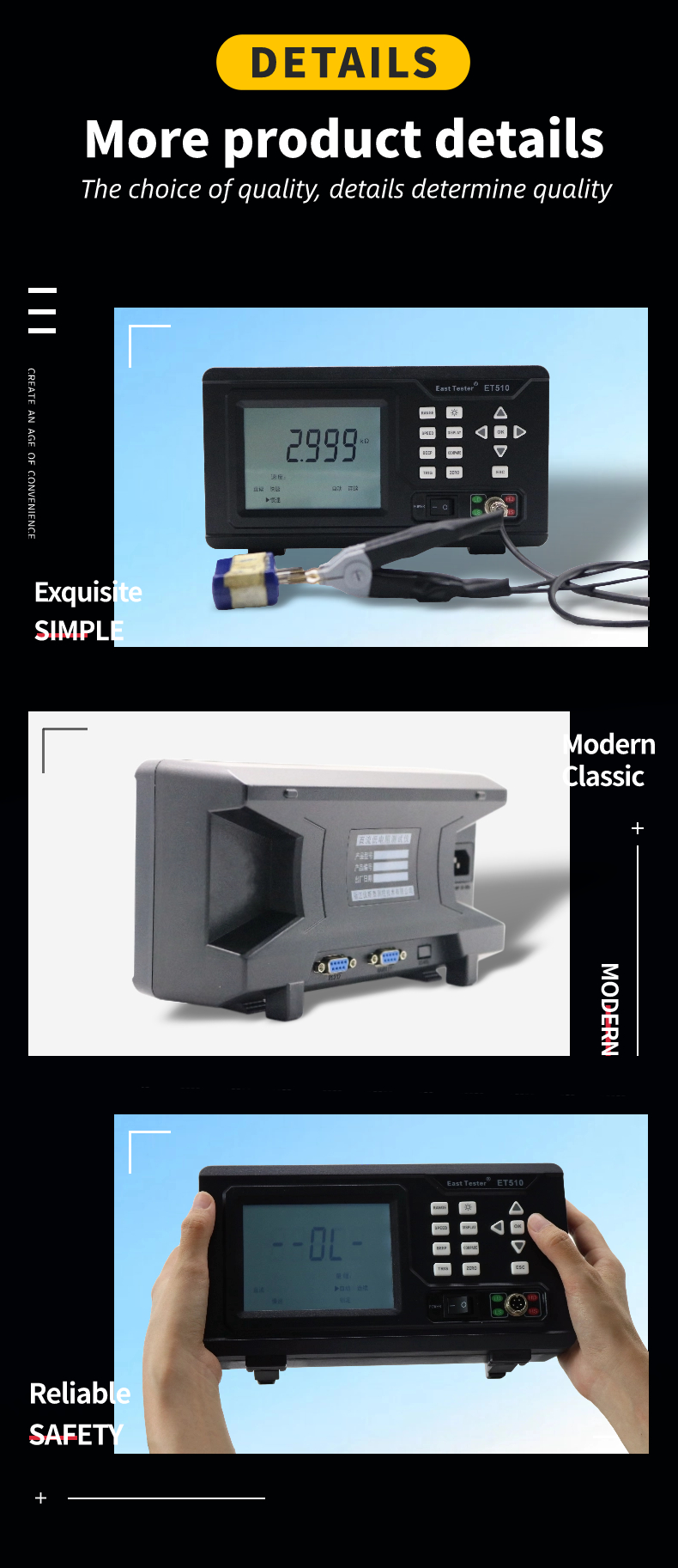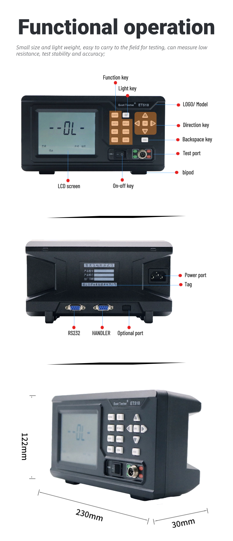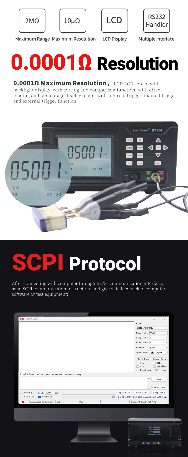 - ET51X series DC low resistance tester is suitable for measuring all kinds of DC medium and low value resistance, including transformer and other wound resistance, relay and other contact resistance, cable and other conductor resistance, connection resistance between metal components, fuse, conductive rubber and other types of DC resistance. Large-screen LCD display, clear display, measuring range of 20mΩ ~ 20kΩ (2MΩ optional), seven (nine optional) range can be adjusted, this product also comes with sorting function and sorting result output function, can be used for pipeline testing. At the same time, it also supports interface communication and control, and standard HANDLER and RS232 interface can be used for PC, PLC and other upper computer communication.