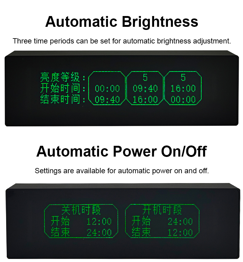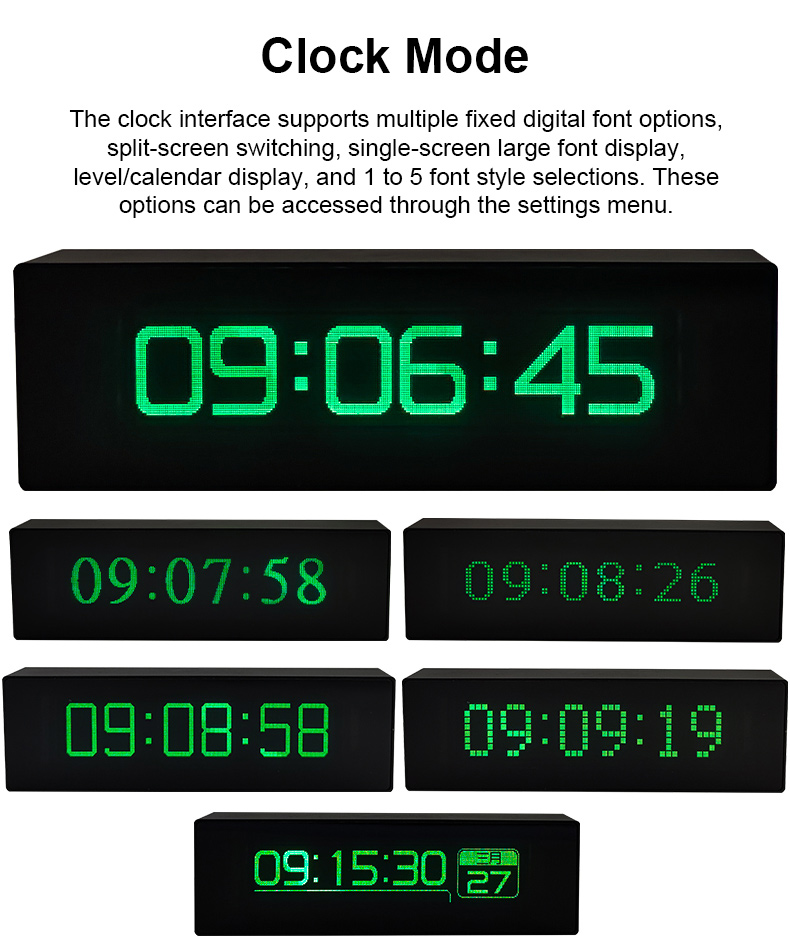 * Font Selection & Brightness Control: It supports multiple font styles, adjustable brightness levels, and both Chinese and English interfaces.