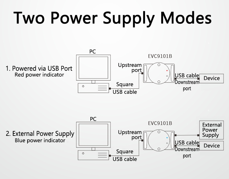 - Power supply mode: USB interface power supply or external (12V DC) power supply, switched by external switch