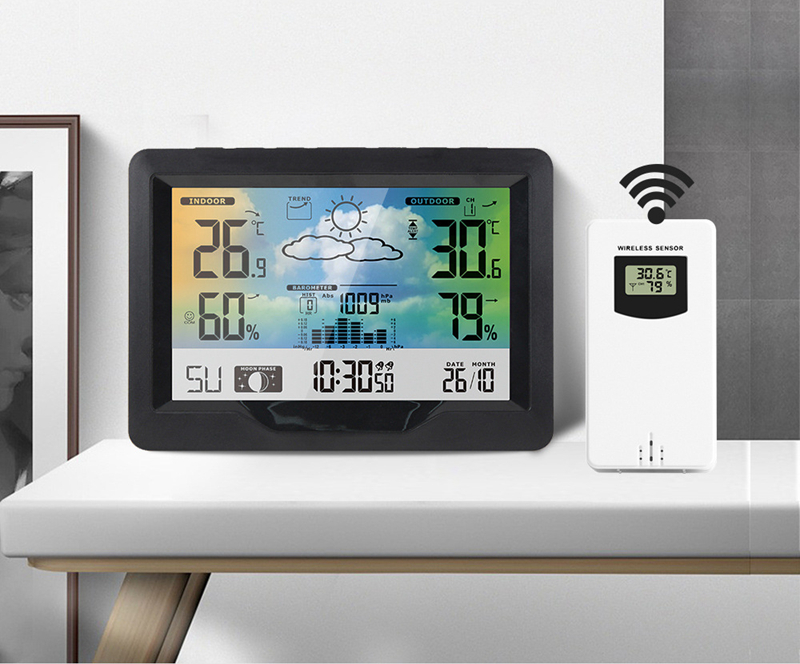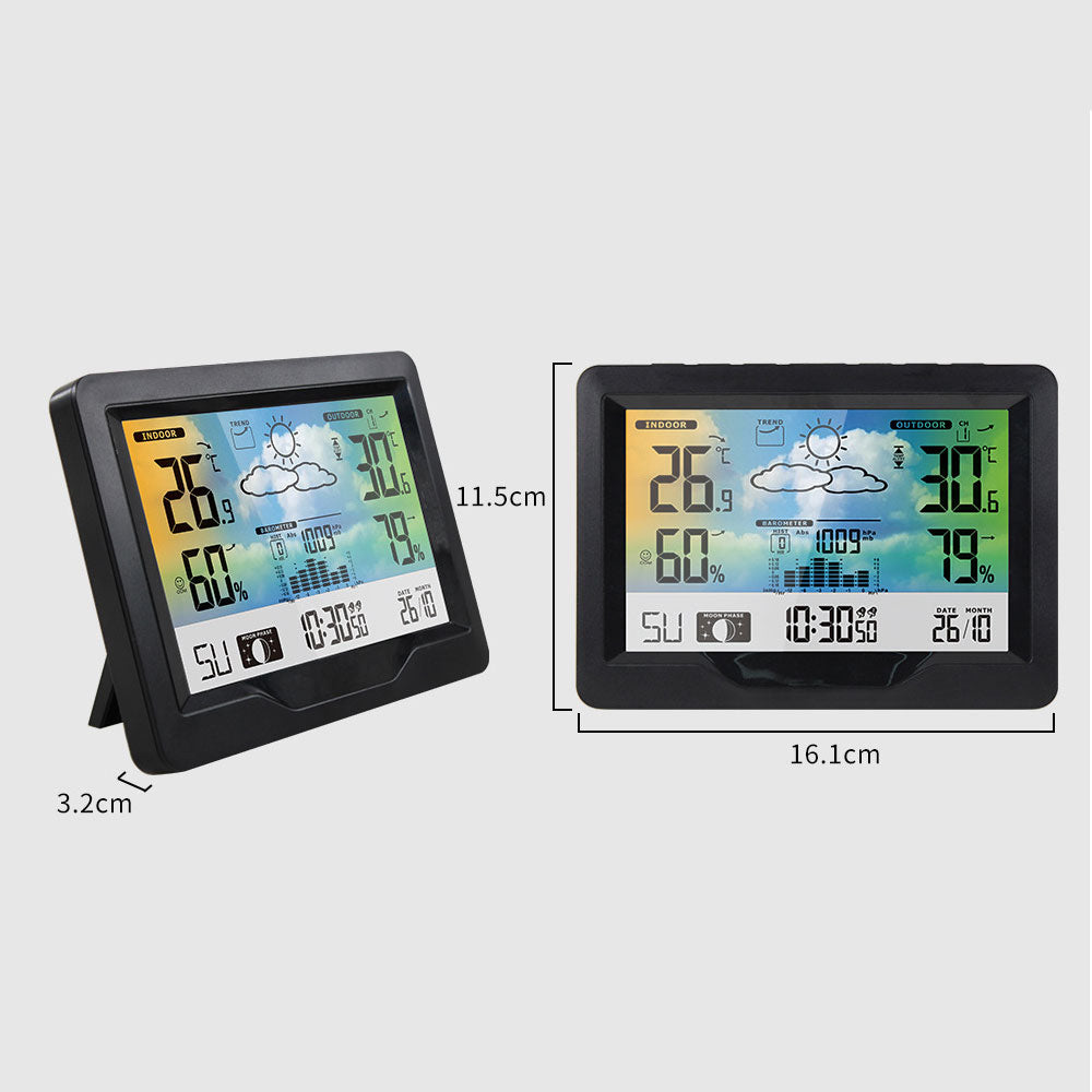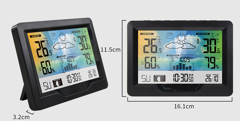 - Multifunctional wireless weather station: Time/calendar/day of week/moon phase/barometric pressure/indoor and outdoor temperature, humidity/weather forecast/trend forecast
