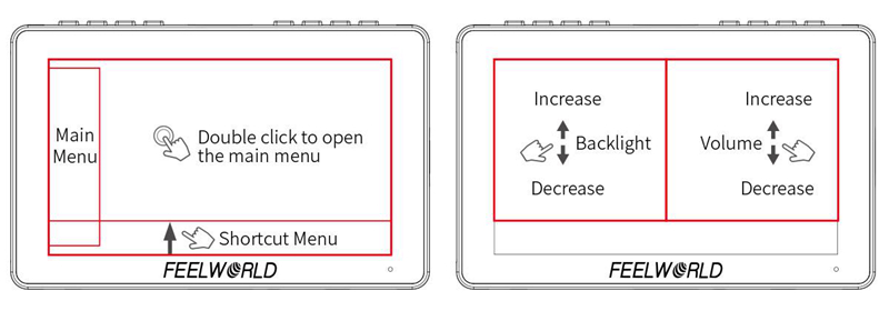 You can touch the screen or physical buttons to browse the menu and set functions. F5 Pro's key distribution design is simple and easy to operate. At the top of the monitor, there are 2 custom function buttons, you can set them as commonly used functions. You can also set the shortcut function of the left and right keys directly in the menu setting function, which can be set to backlight adjustment or volume adjustment, directly press "﹤" to decrease the value; directly press "﹥" to increase the value. And the monitor will automatically save the parameters you have previously set, and keep the original settings when you turn it on next time. It does not need to be reset, which is convenient and simple.