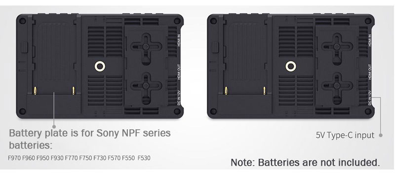 In addition to the power supply through the F970 battery plate and 12V DC power input, it also supports 5V Type-C input, which can be powered by mobile phone charger or power bank. (At least 5V/2A)