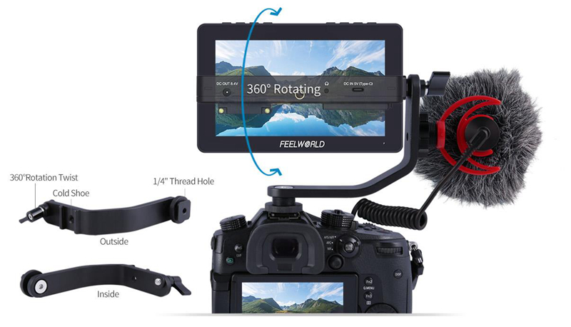 The FEELWORLD F5 Pro is an ideal camera-top monitor for DSLR and mirrorless camera shooters. Because the F5 Pro provides auxiliary power out; allowing shooters to power their cameras. With a battery adapter cable (Optional), the F5 Pro extends camera run-time, while providing a more usable display.
