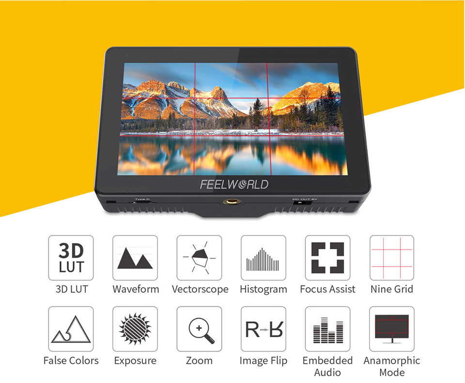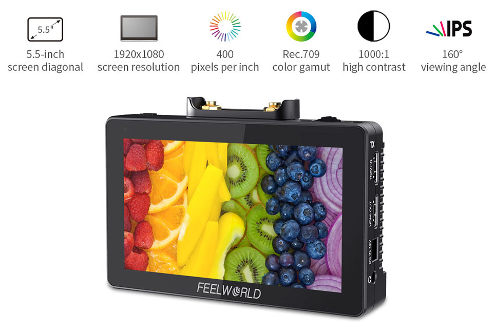 The 5.5" IPS screen features a 1920 x 1080 resolution, packing 400 pixels per inch and provides a wide viewing angle of 160°and for easier off-axis position monitoring. Built-in 3D LUT color calibration, which complies with the standard of REC-709, can calibrate each monitors so that it can eliminate the trouble of color cast.