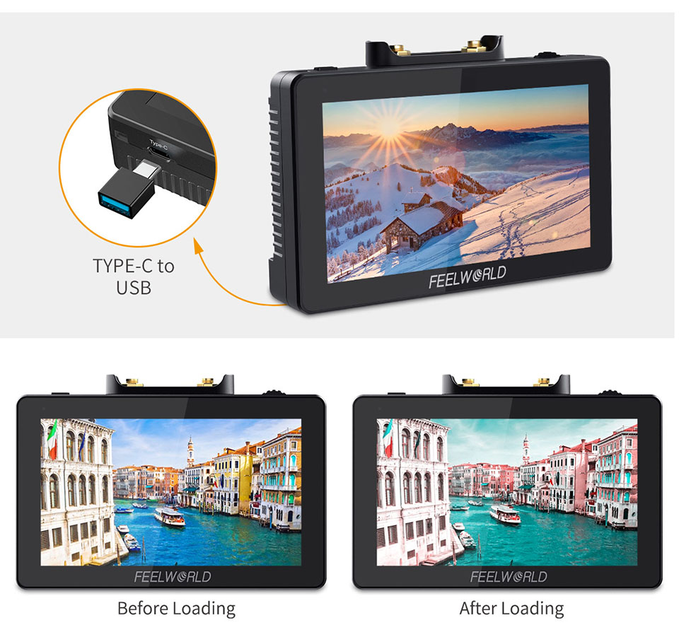 FT6 FR6 provide S-log2/3, V-log, Log-C etc, to convert log mode to REC709 for all major cameras. The LUT loading function makes the color calibration work of the previous shooting easier and more intuitive, optimizes the workflow and improves work efficiency. User creative 3D LUT cube or calibration 3D LUT cube can be uploaded to FT6 FR6 by TYPE-C to USB.