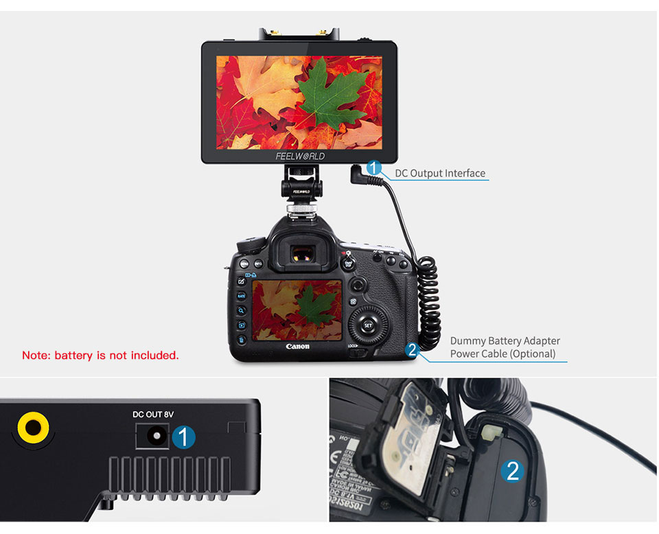 - Note: since different brands and models of cameras require different power for normal operation, the camera may not be able to take pictures or video normally. Therefore, when using batteries to power the monitor, in order to use the camera normally, it is recommended to use a large-capacity fully charged battery (battery is not included).
