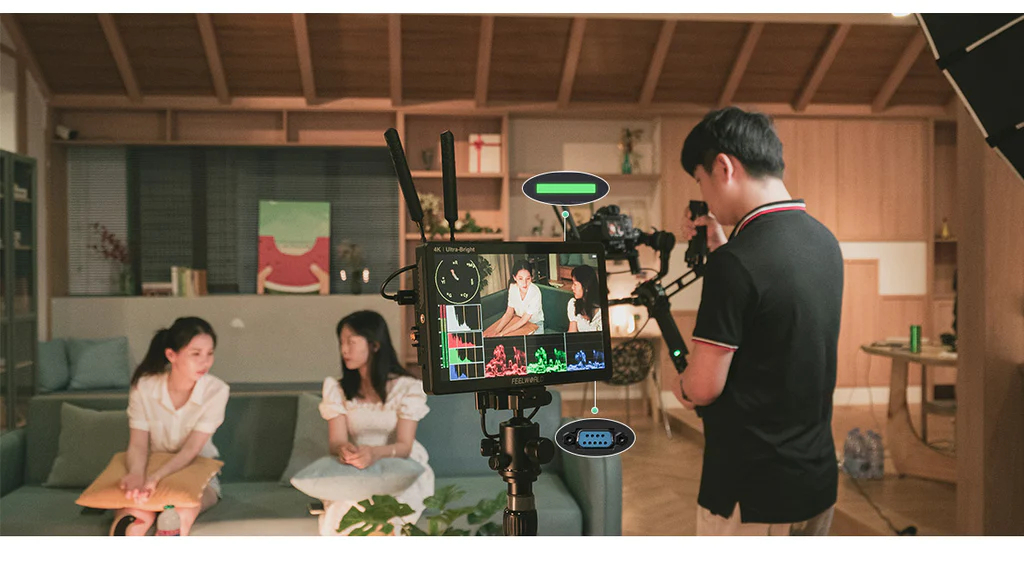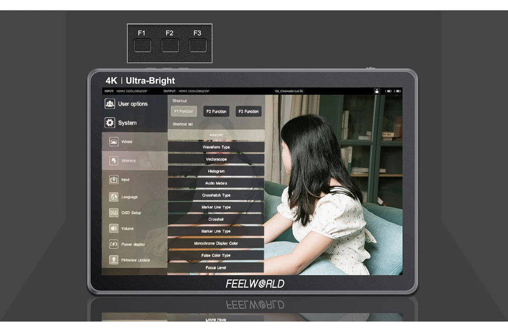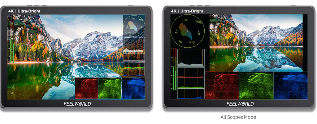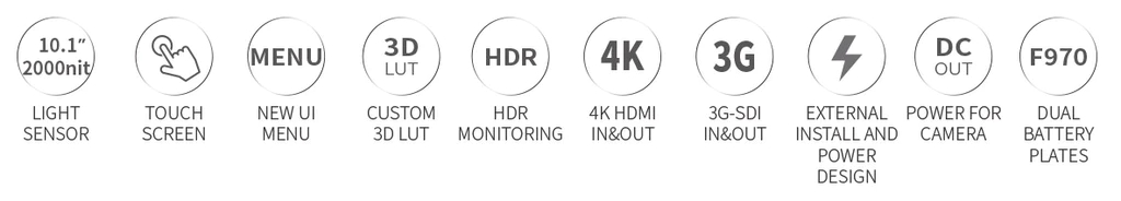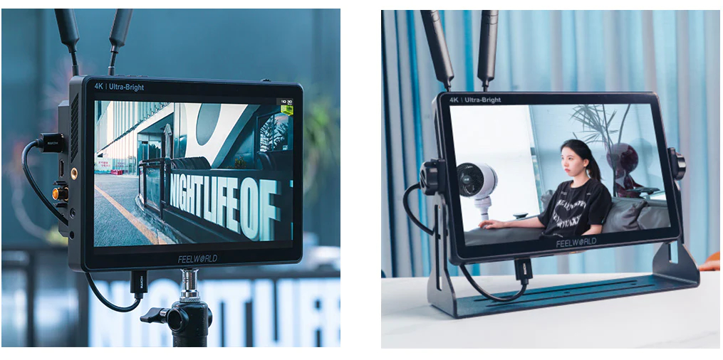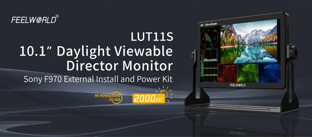 FEELWORLD LUT11S is a 10.1-inch with full touch screen, ultra brightness 2000nit professional camera monitor. Supports 3G-SDI and up to 4K at 60Hz HDMI signal input and output. Provides a series monitoring and framing tools with new menu layout, various numerical parameters are clear at a glance, making the operation easier. There is a F970 external install and power kit on the rear of LUT11S, which can install such as wireless transmission, LED light, etc. It combines the monitor with wireless transmission to get rid of unnecessary cables, , which is perfect for director monitoring, 1st AC to focus pulling in the film crew. The dual battery plates design can install two F970 batteries at the same time for long-time power supply even outdoors. Ideal for crew field shooting, monitoring and post-production.