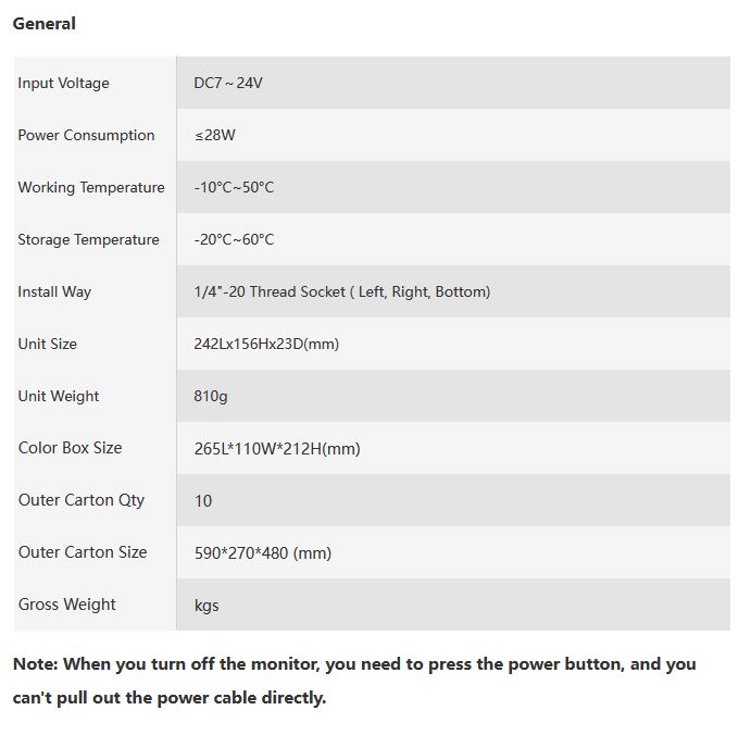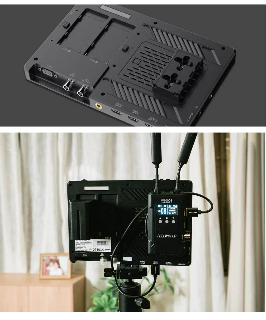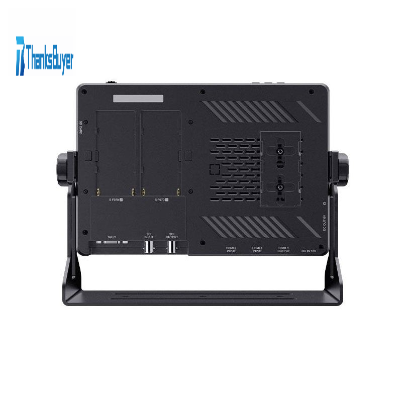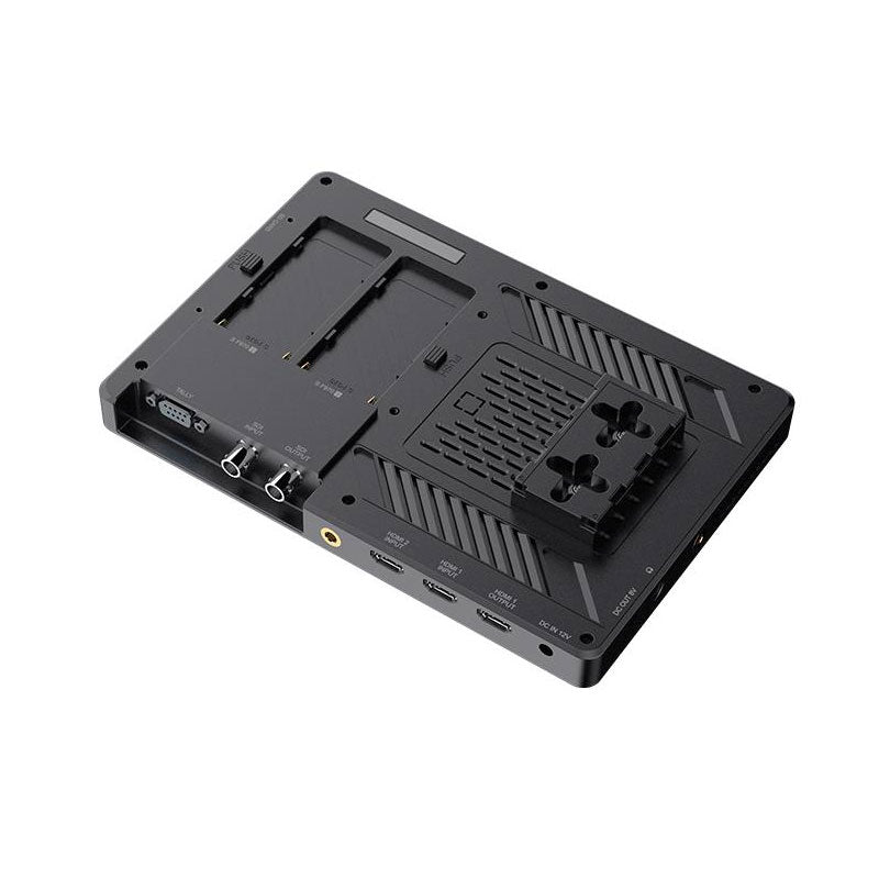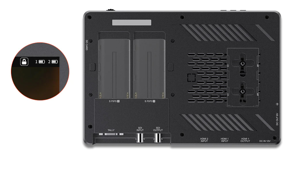 - A F970 (for Sony) external install and power kit design is added to the back of the monitor. The external kit can be used to install and install the external equipment, like wireless transmission, LED light, video converter and others that can be powered by a F970 battery for Sony. This innovative external power supply design meets the need to power for external wireless transmission, LED light and other equipment, greatly saving the space occupied by the equipment and reducing the weight of photography equipment.