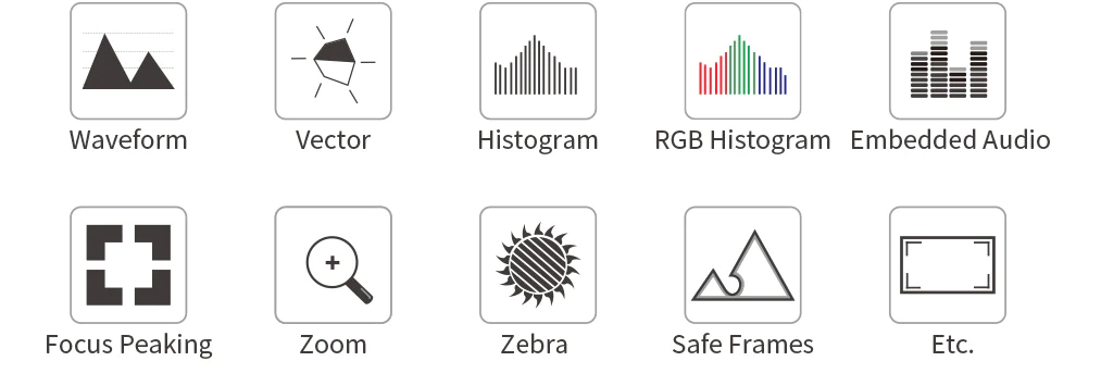 Our flexible OS is packed with an extensive suite of scopes, all 1-touch away and simple to use. The Video OS includes tools for focus, framing & exposure (waveform, RGB parade, vectorscope, RGB histogram, histogram, embedded audio, focus peaking, zoom, zebra, false color, safe frames, etc.) as well as a flexible 3D LUT implementation (use built-in LOG to Rec.709 video or upload .cube files) and options for anamorphic de-squeeze monitoring.