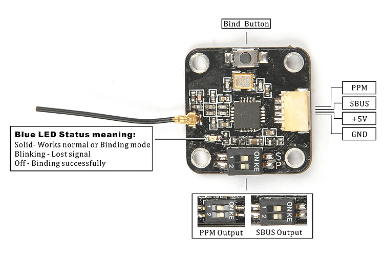 1. Power for the receiver when pressing the Bind button. The blue LED on the receiver will always be on, which means the receiver is in binding mode,