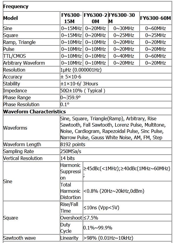 1. The output frequency of FY6300 series sine wave can reach 60MHz (FY6300-60M), and the maximum output frequency of square wave can reach 25MHz.