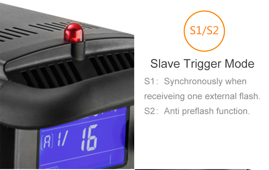 Triggering Mode: sync cord/slave triggering/test button/wireless control port