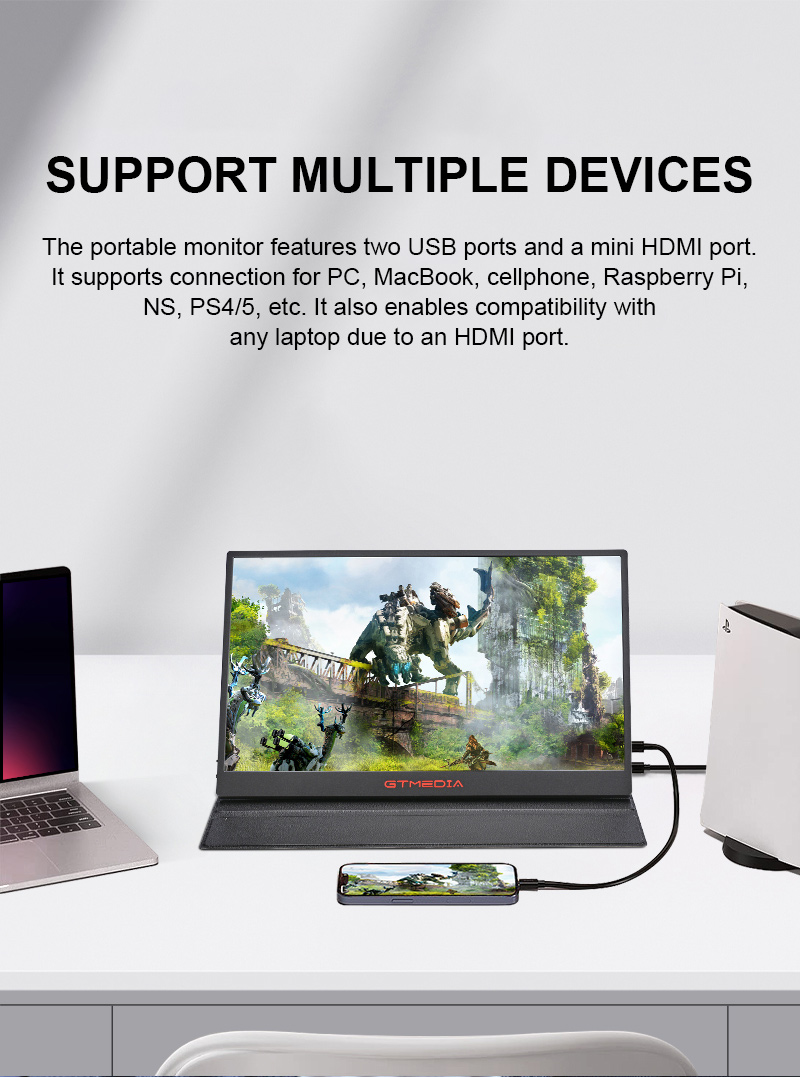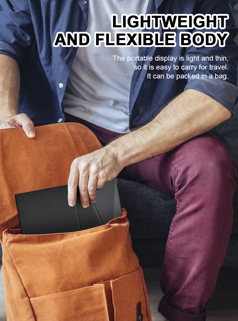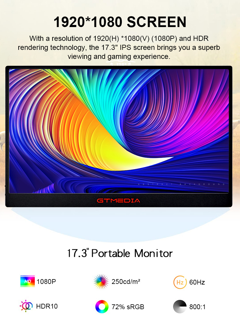 This portable monitor uses a 17.3-inch IPS FHD screen with a resolution of 1920*1080. It supports 178-degree wide viewing angles. Its HDR rendering technology restores real pictures, with stronger contrast, more dynamic range and image details, bringing you awesome viewing experience.