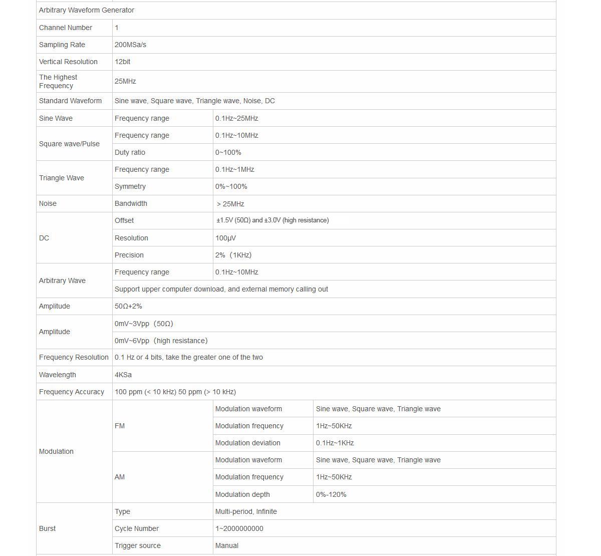 - Arbitrary function generator: Its output frequency is up to 25MHz with 12bit high resolution and high sampling rate. With built-in arbitrary waves, it supports AM/FM modulation. Output high impedance and low resistance are switchable. One-key waveform storage makes it convenient and fast to use.