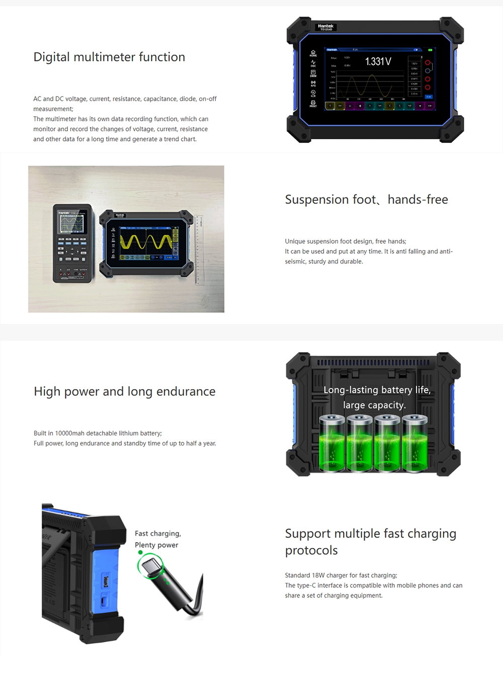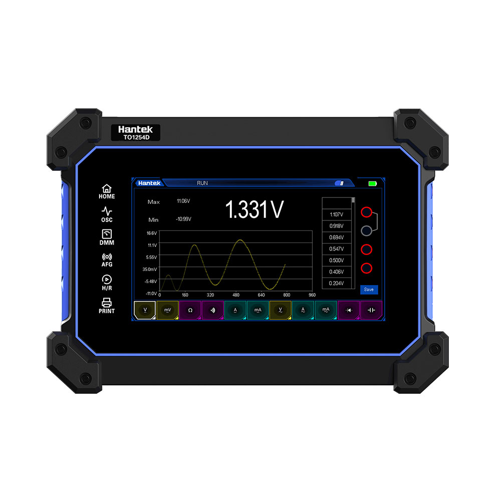 - The new generation of TO1000 series multi-functional full touch screen oscilloscope has a thin body, light weight and is easy to carry; Unique hanging design, hands-free, anti falling and anti-seismic, sturdy and durable; It integrates oscilloscope, multimeter, signal generator and spectrum analyzer; Built in super large capacity battery, long endurance, support fast charging, and abundant power.