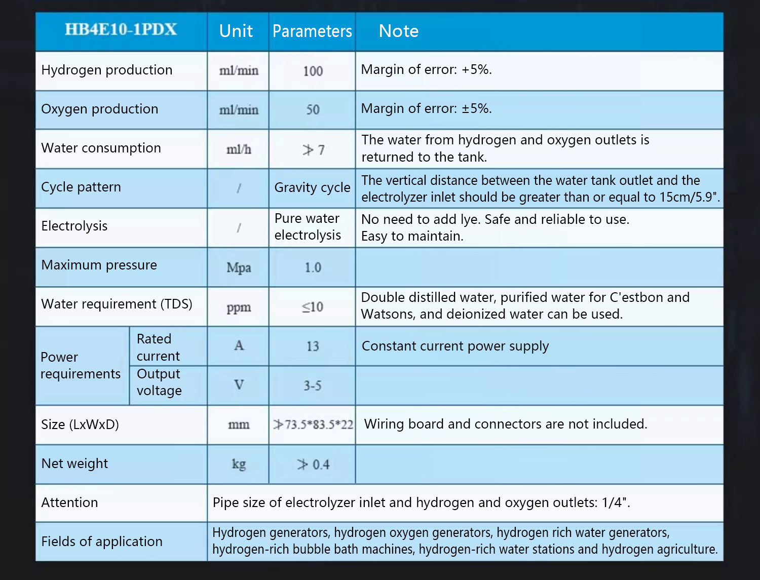 - Its service life can reach 5-10 years. The voltage is low, less than 1.7~2.2V. It eliminates ozone production. Under the premise of reasonable water quality, water temperature and system design, it is better to produce hydrogen for more than 6000 hours for 8~24 hours in a row