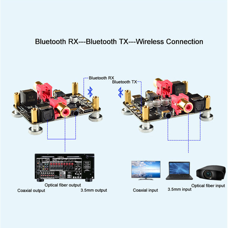 - Highly integrated 5.0 chipset Bluetooth receiving, transmitting, coaxial, optical fiber input, output 3.5 mm input and output functions in one. HiFi sound quality.