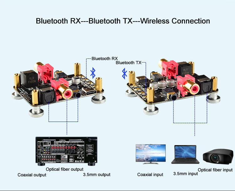 - Highly integrated 5.0 chipset Bluetooth receiving, transmitting, coaxial, optical fiber input, output 3.5 mm input and output functions in one. HiFi sound quality.