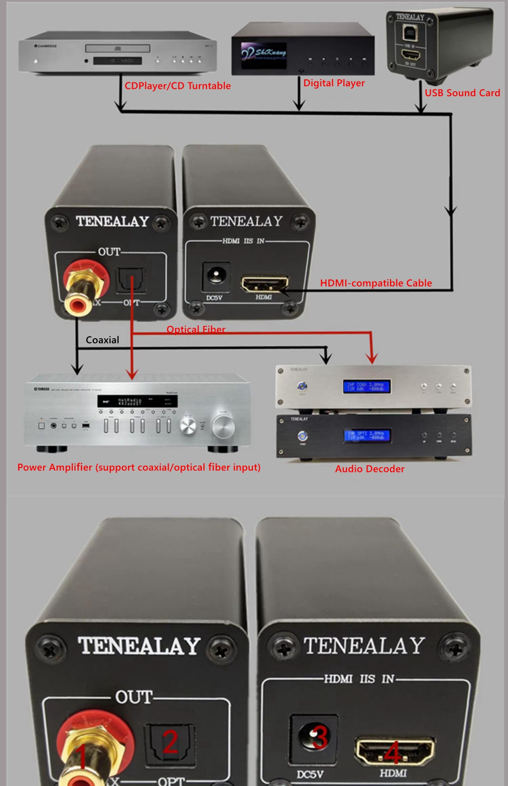 - It can convert differential signals output from HDMI-compatible IIS ports such as digital players, CD players, and CD turntables into SPDIF coaxial and fiber optic signal outputs. The HDMI-compatible IIS input port is converted to SPDIF coaxial and fiber optic output ports.