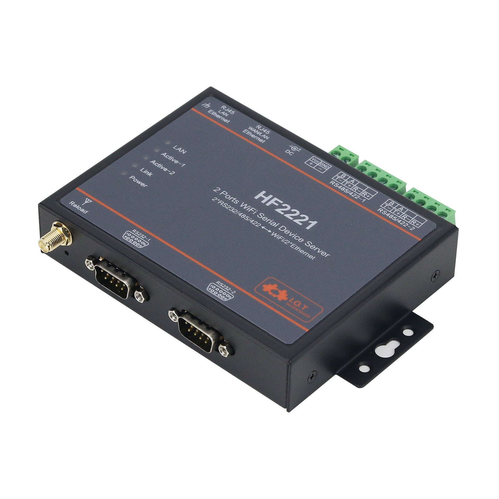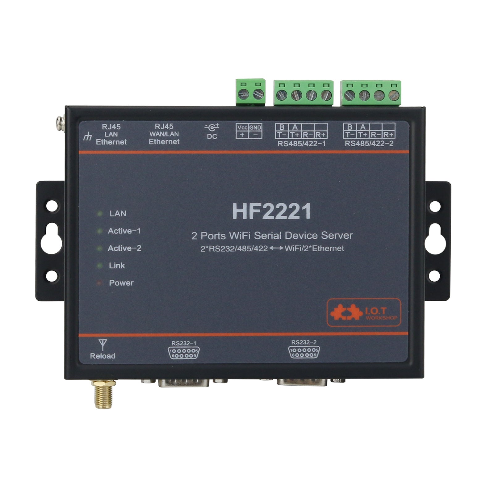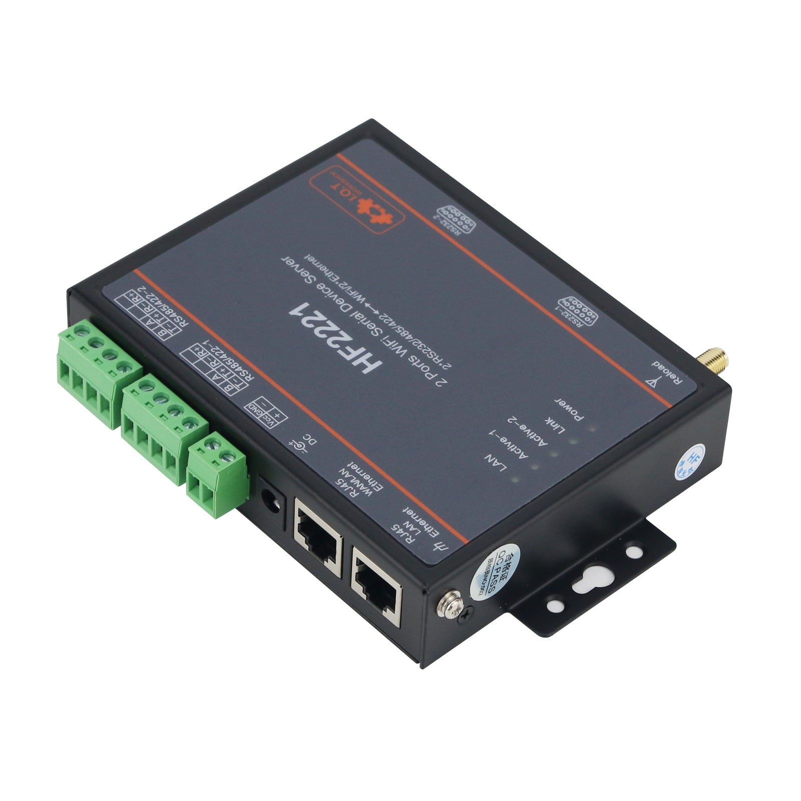 HF2221 Industrial Grade 2-Port Serial Server RS232/485/422 to Wifi/Ethernet w/ Rubber Wifi Antenna