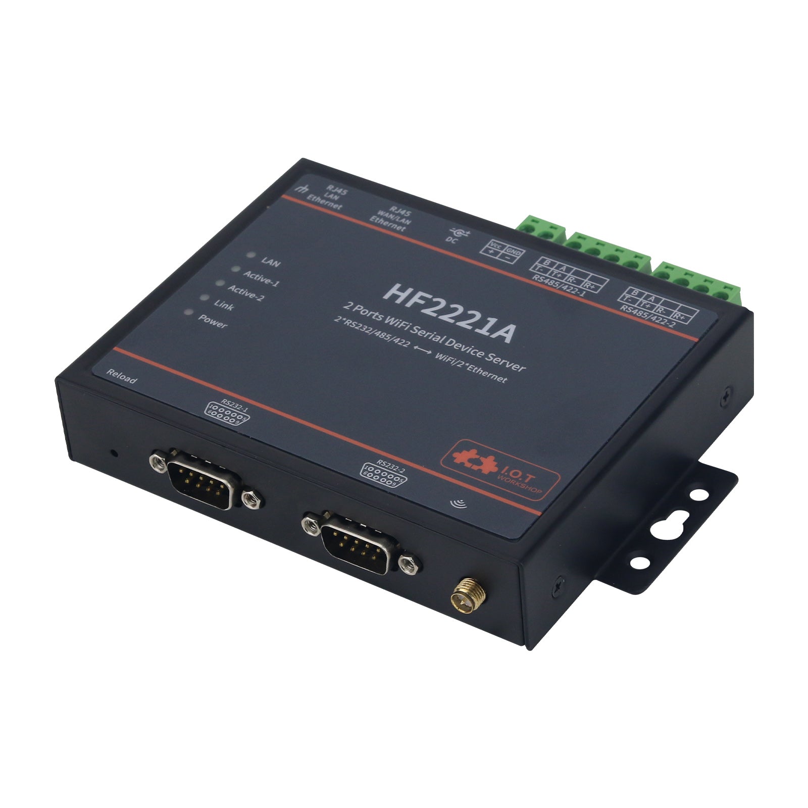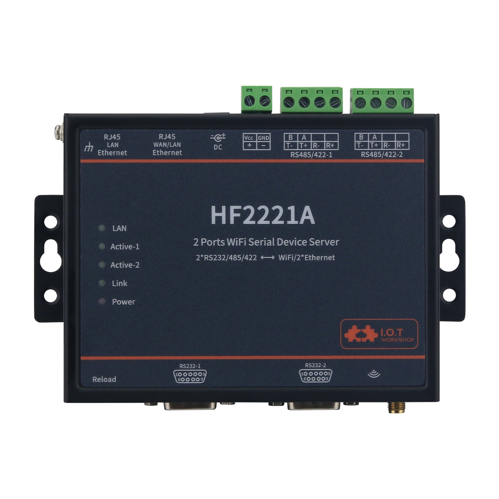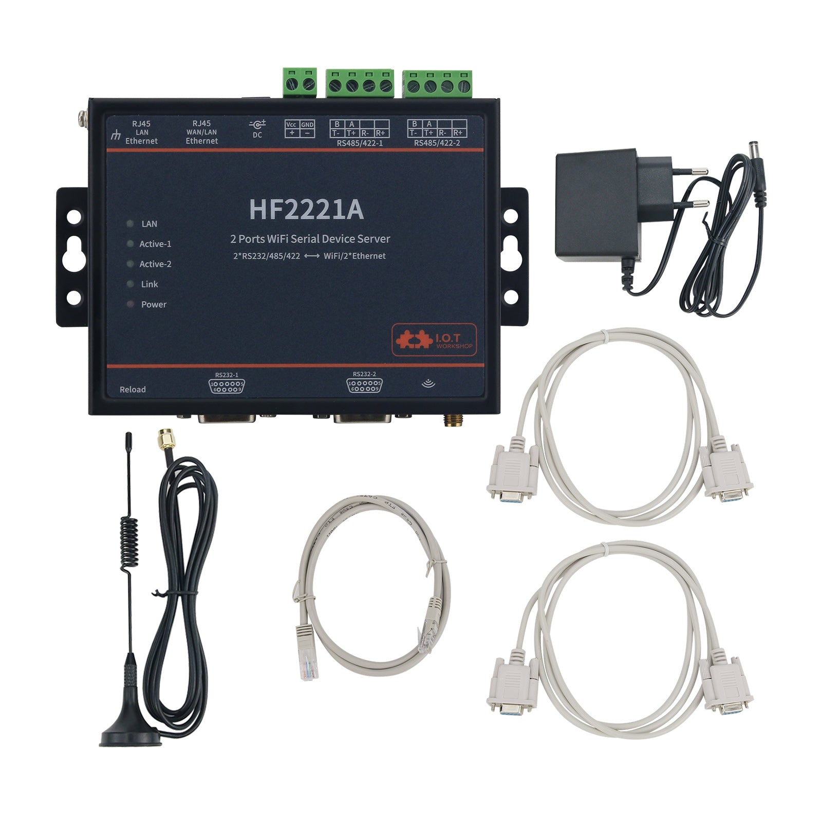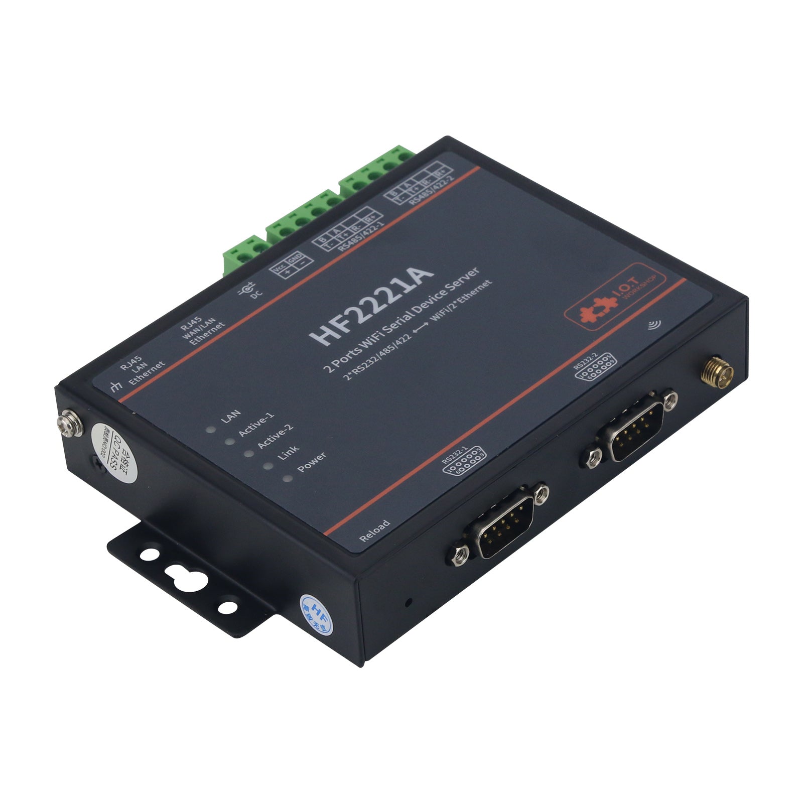 HF2221A Industrial Grade 2-Port Serial Server RS232/485/422 to Wifi/Ethernet w/ Suction Cup Antenna