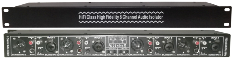 After audio signal passes through the audio signal isolator, the potential difference between the two devices can be completely isolated, avoiding hum interference caused by grounding problems, and preventing excessive potential difference from damaging the input stage of the device. It realizes the safe transmission of audio signals, removes the noise generated by the connection of audio equipment, the noise generated by the notebook computer connected to the mixer; removes the noise generated by the electronic musical instrument connected to the mixer; removes the noise generated by the long-distance cable transmission between the equipment and the equipment. Remove the noise caused by the impedance mismatch between the device and the device. Solve the humming caused by the site electricity, wiring, light interference and other reasons. The 8-channel audio signal noise isolator is also suitable for all large-scale outdoor and indoor performances, lightning protection, sound engineering, conferences, entertainment venues, exhibition halls, movie K movie bars, home theaters, KTV karaoke machine systems, CD players, and vehicles music, Bluetooth music, LED large screen interference, recording system and other audio equipment systems are used. It is an essential equipment for audio system cascading to eliminate noise. Almost all audio equipment and equipment can use audio signal noise isolator to isolate and eliminate noise and hum. It can also be used as a passive DI box, supports hot plugging, can eliminate the equipment in the normal power-on working state, plug the XLR cable or 6.35mmTRS head will not produce impact sound; eliminate the damage to the equipment caused by improper operation.