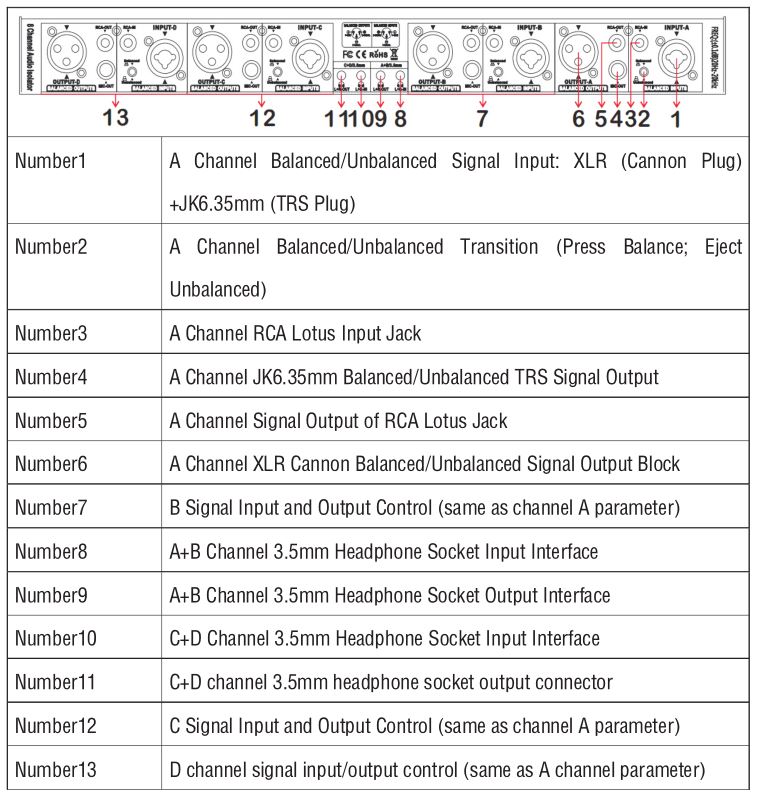 - Key switch: A, B, C, D channel balanced/unbalanced audio signal conversion