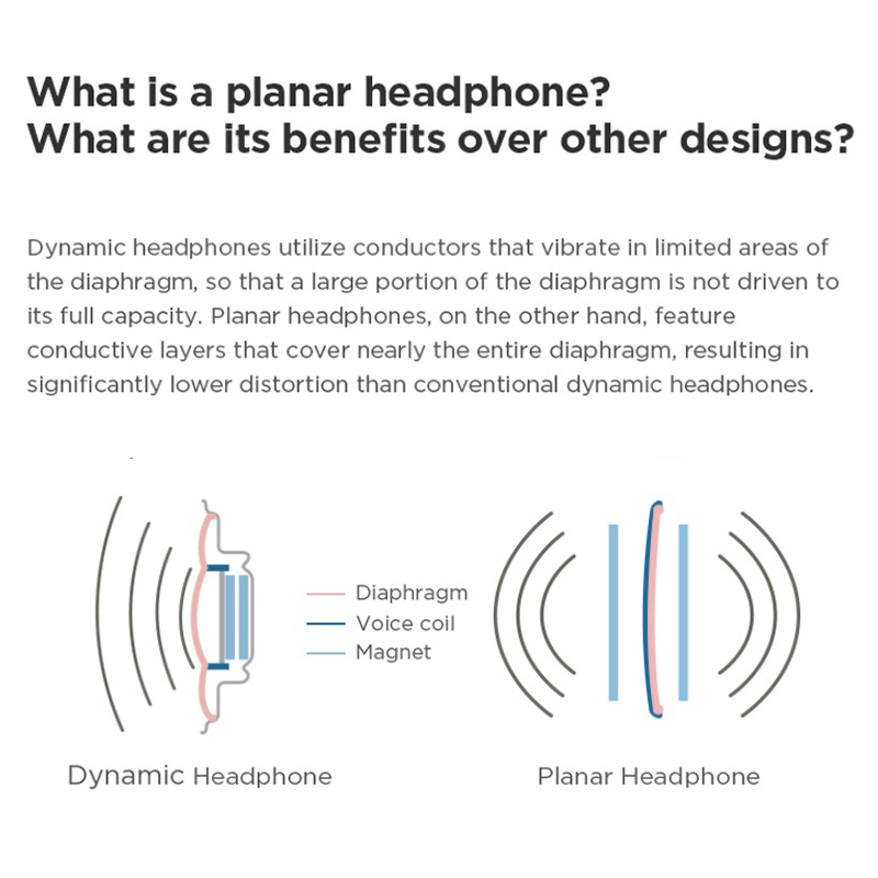 Planar headphones feature conductive layers that cover nearly the entire diaphragm, resulting in significantly lower distortion than conventional dynamic headphones.