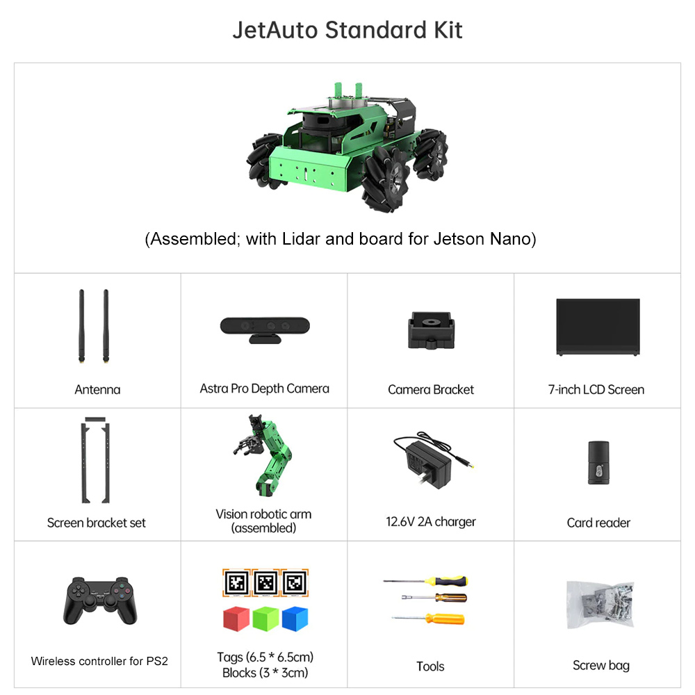 JetAuto Pro is a comprehensive 2 in 1 ROS robot tailored for ROS learning. It is loaded with board for NVIDIA Jetson Nano, AI vision robotic arm, high-performance encoder motor, Lidar, 3D depth camera and 7-inch screen, which open up more functionalities. Robot motion control, mapping and navigation, path planning, tracking and obstacle avoidance, autonomous driving, intelligent picking, simulation for MoveIt, somatosensory interaction and voice interaction all can be achieved!