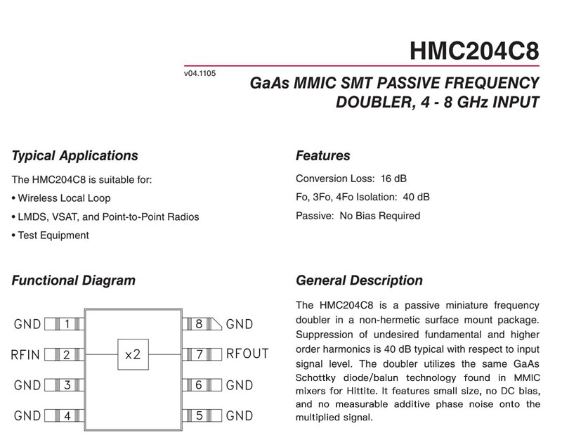 - HMC204: RF input (4-8GHz); RF output (8-16GHz)