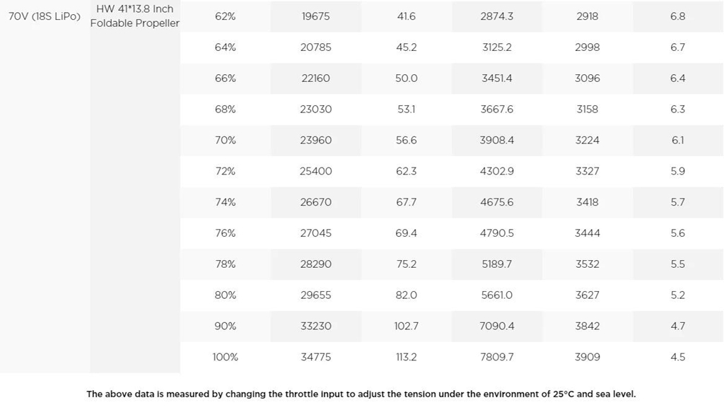 - Recommended takeoff weight: 15 - 17kg/rotor for 14S version; 15 - 18kg/rotor for 18S version