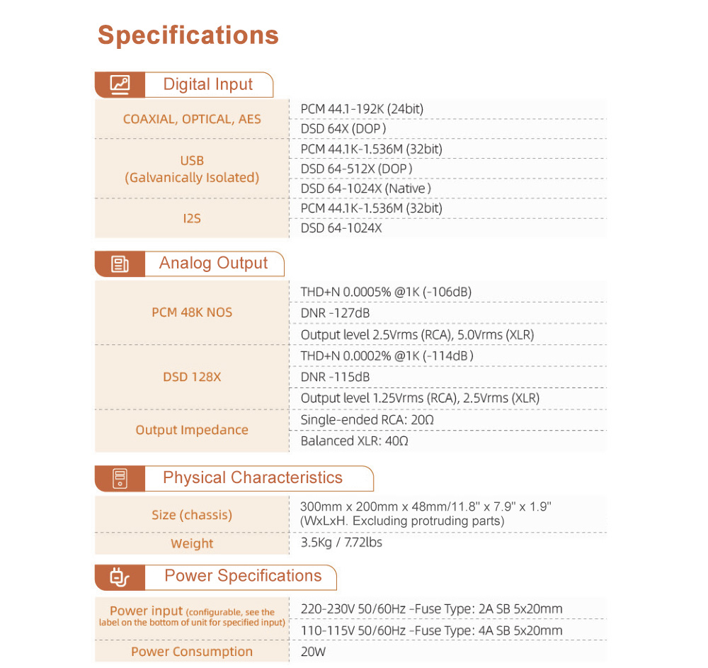 • USB interface (galvanically isolated) supports sampling rates up to DSD1024 and PCM 1.536M.