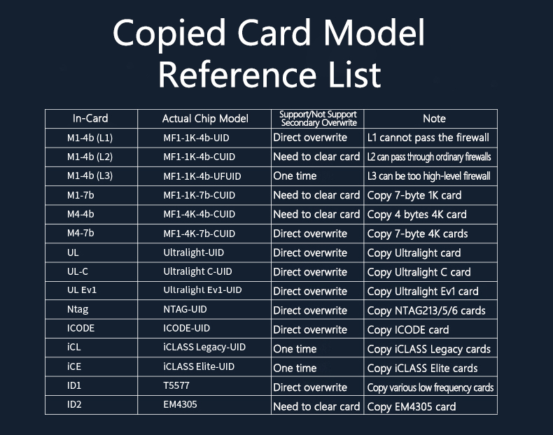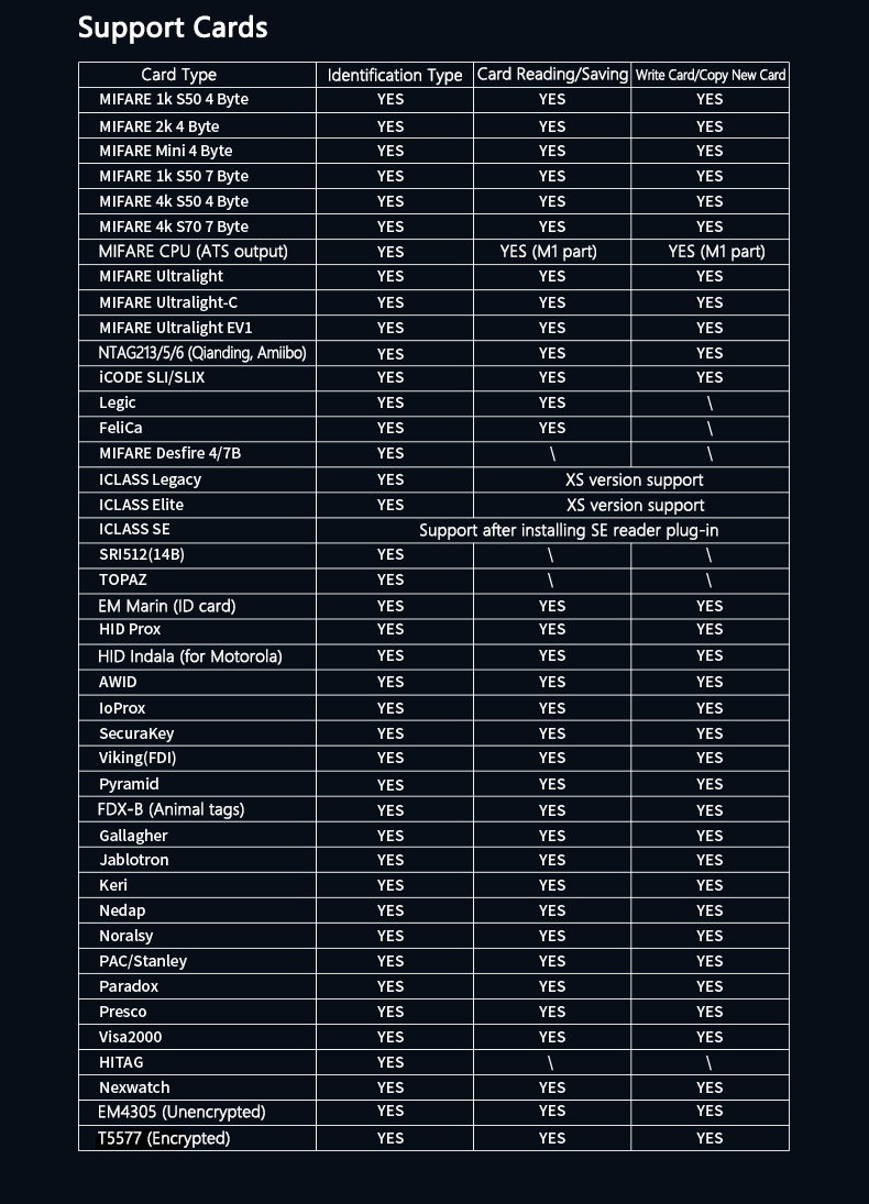 Among the supported cards, 98% of the cards can be decrypted and copied. But it is not ruled out that a few special variant cards cannot be cracked conventionally. Decryption can be assisted by sniffing, chameleon detection and other means.