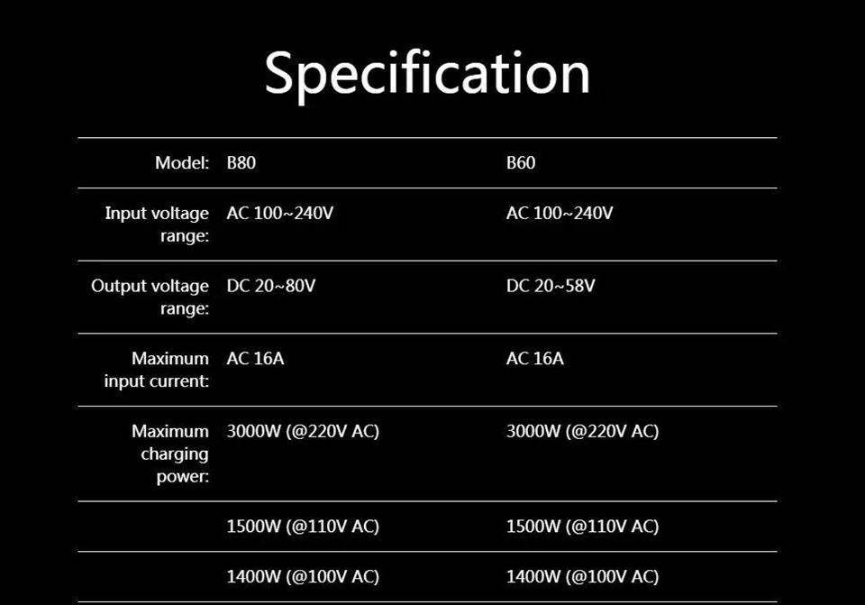 - Maximum charging power: 3000W at 220VAC; 1500W at 110VAC; 1400W at 100VAC