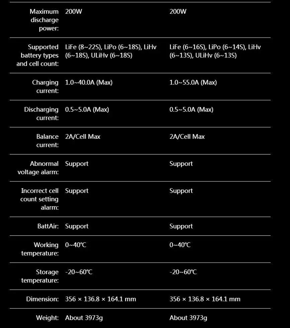 - Supported battery types and cell count: LiFe (8-22S)/LiPo (6-18S)/LiHv (6-18S)/ULiHv (6-18S)