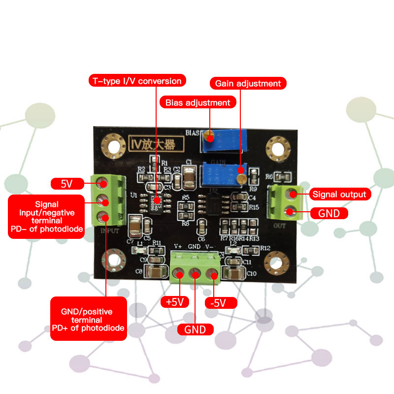 A1: First, you need to determine whether the module is powered by a positive and negative dual power supply. Secondly, adjust the bias potentiometer, adjust the output to close to 0, and then connect to a photocell or input current. When there is current input or the photodiode has photo-current generated, the output voltage will change. If the output voltage does not change, it may be that the magnification is too small. You can turn the potentiometer clockwise to increase the magnification.