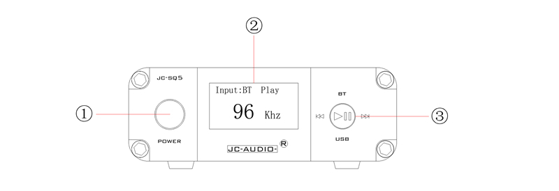 ② Display window. Input: input mode. BT Play indicates current Bluetooth mode, and USB Play indicates current USB decoding mode. The large number in the middle shows the current digital signal sampling rate.
