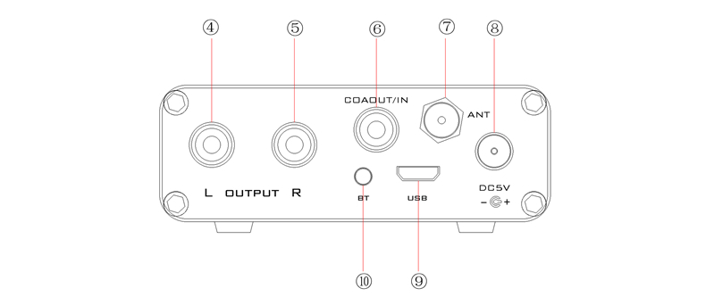 ⑥ Coaxial digital signal interface. This interface supports digital signal output or input. The specific method of use is: when Bluetooth or USB mode is in use for connection, this interface is digital signal output. When the Bluetooth or USB mode is not connected and not used, this interface is for digital signal input. Whether the machine is set in BT or USB mode, it can decode coaxial digital signals.
