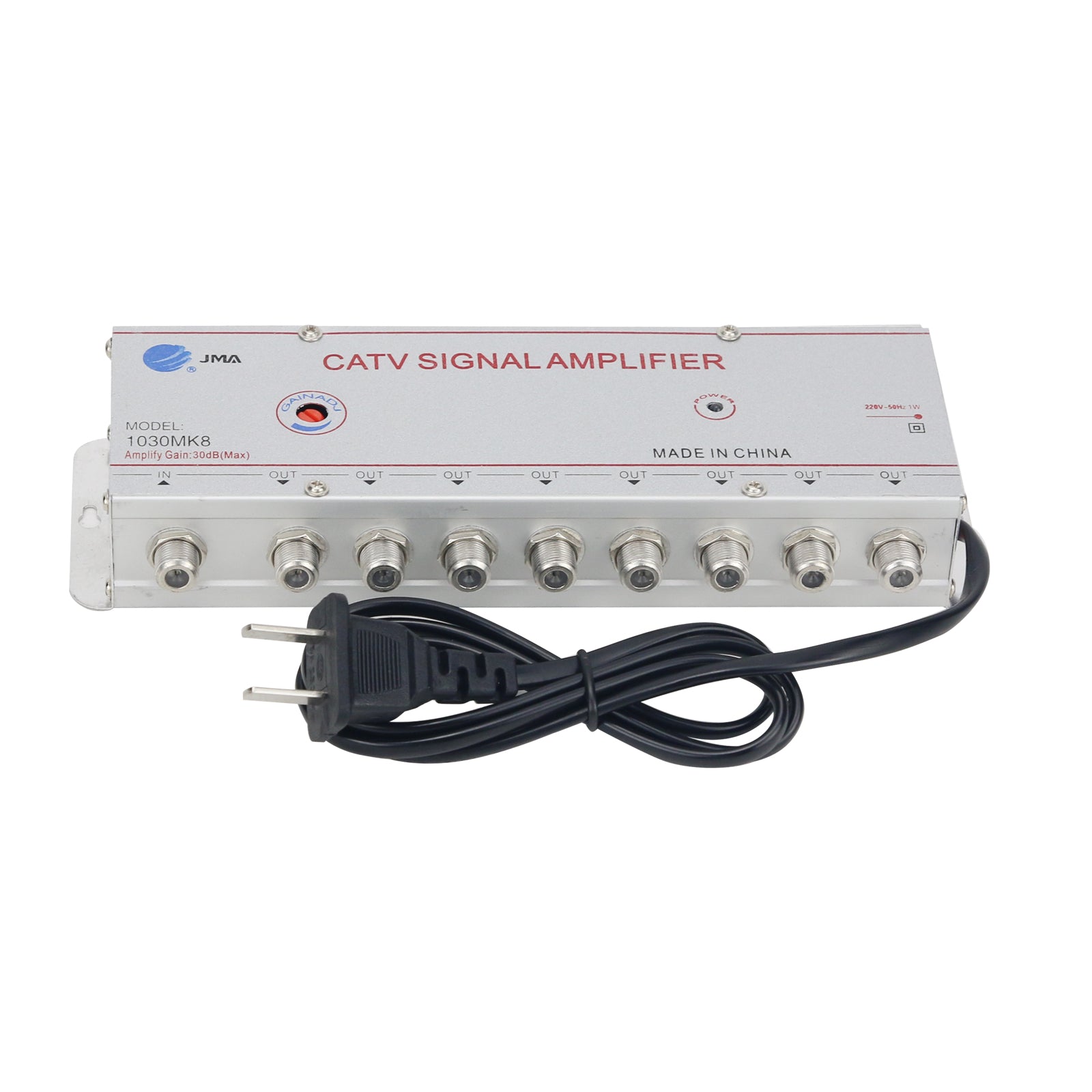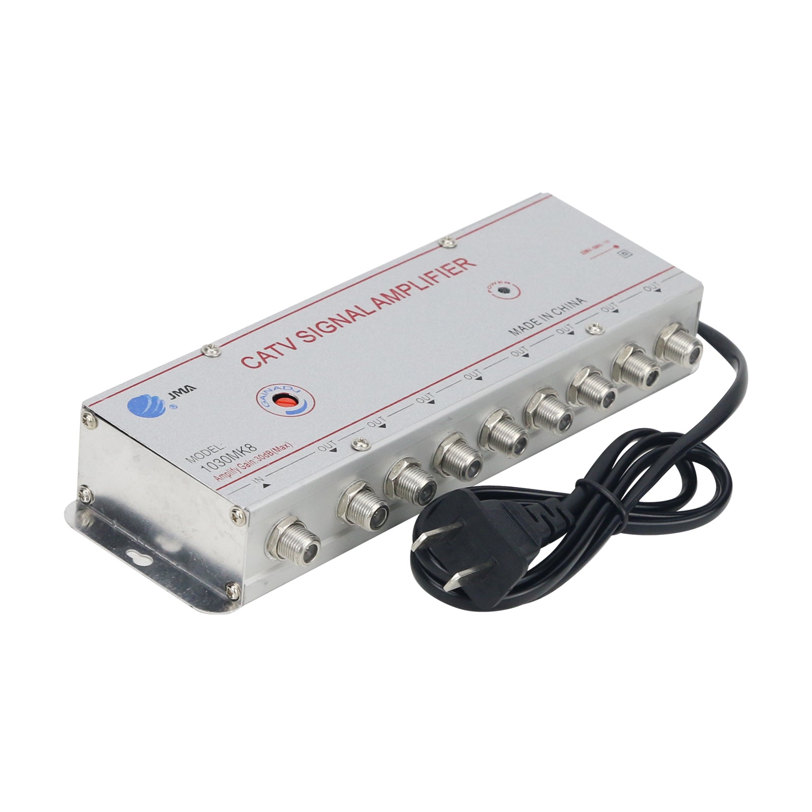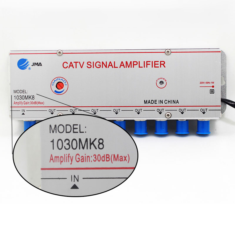 JMA 1030MK8 Cable TV Signal Booster replaces SB-1030M8, with the same function. It is suitable for LCD TV and digital TV, and its gain can be adjusted up to 30DB.