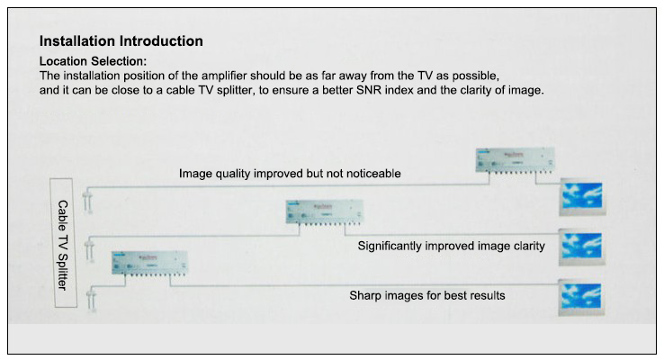 - When the signal strength of multiple TVs to be connected is insufficient, use the amplifier to amplify first and then perform multi-channel branch distribution