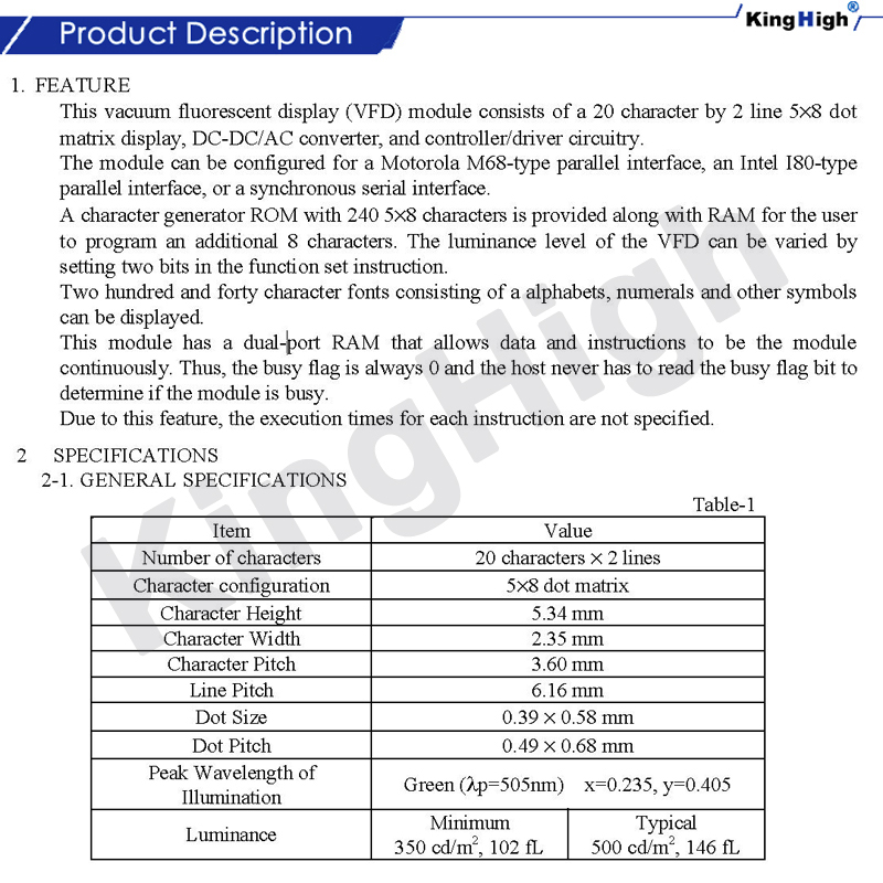 KH202SD58R1-M VFD Display Vacuum Fluorescent Display 20*2 Replacement For 20T202DA1J M202SD16 20M2B0B