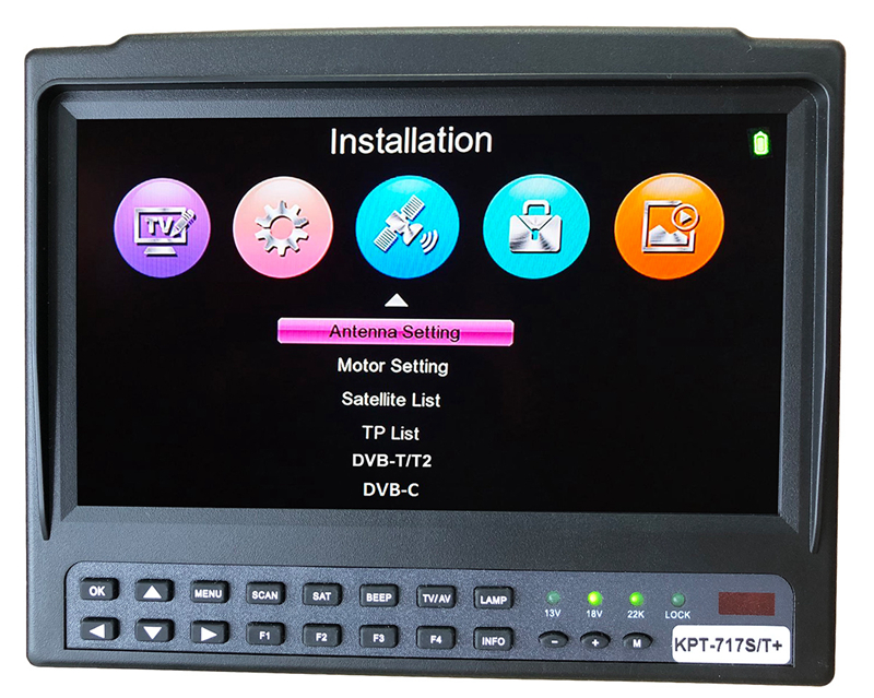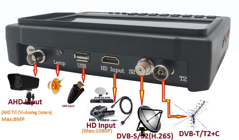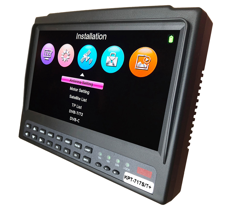 * 7" High definition TFT LCD Screen which can display channels (DVB-S/S2+T/T2+C); Support DVB-S/S2 MP4 HEVC (H.265) AVS/AVS+