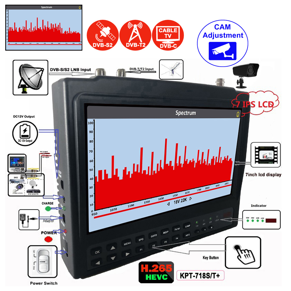 - 7" Inch High definition TFT LCD screen can display channels (DVB-S/S2+T/T2+C). <Support DVB-S/S2 MP4 Hevc (H.265) AVS/AVS+>