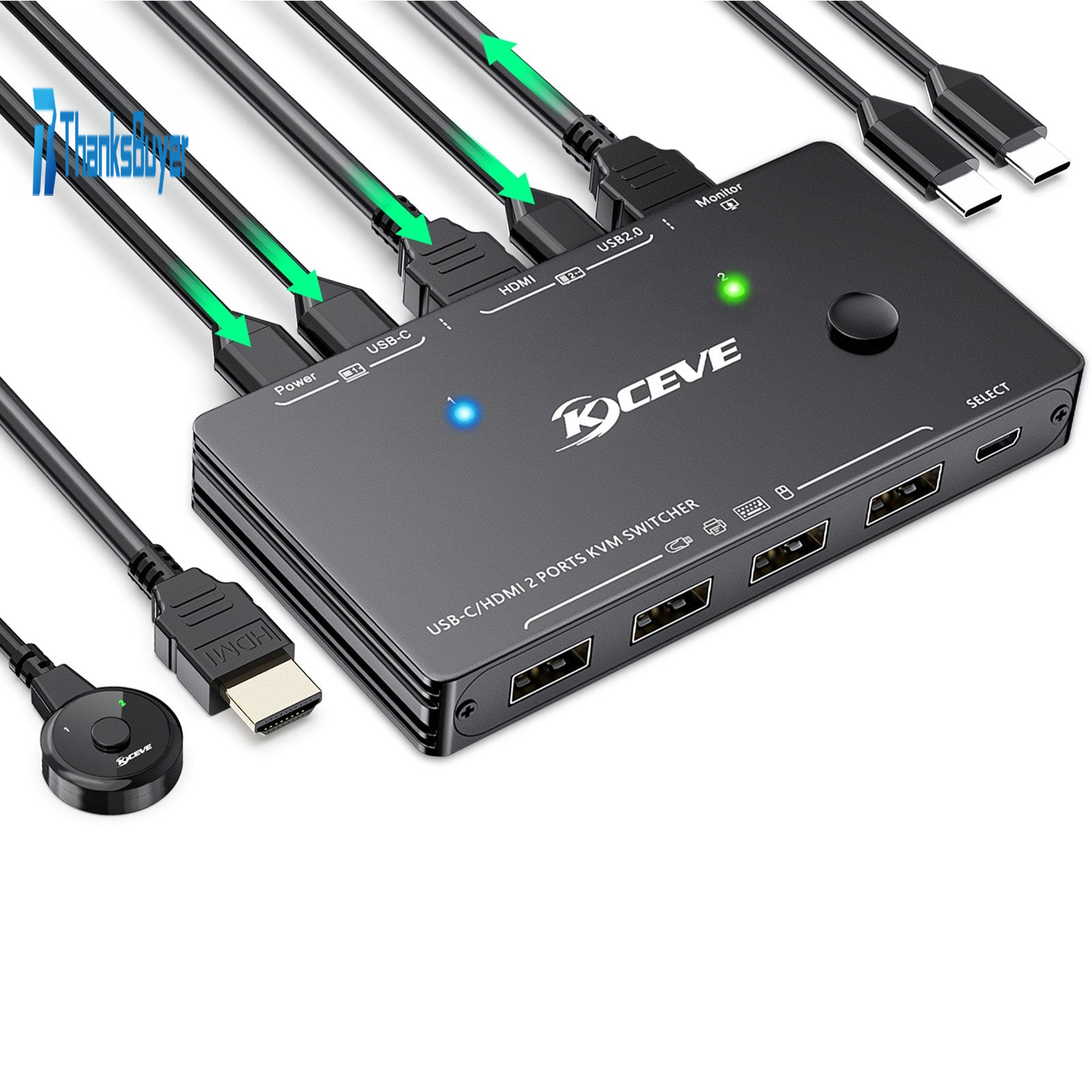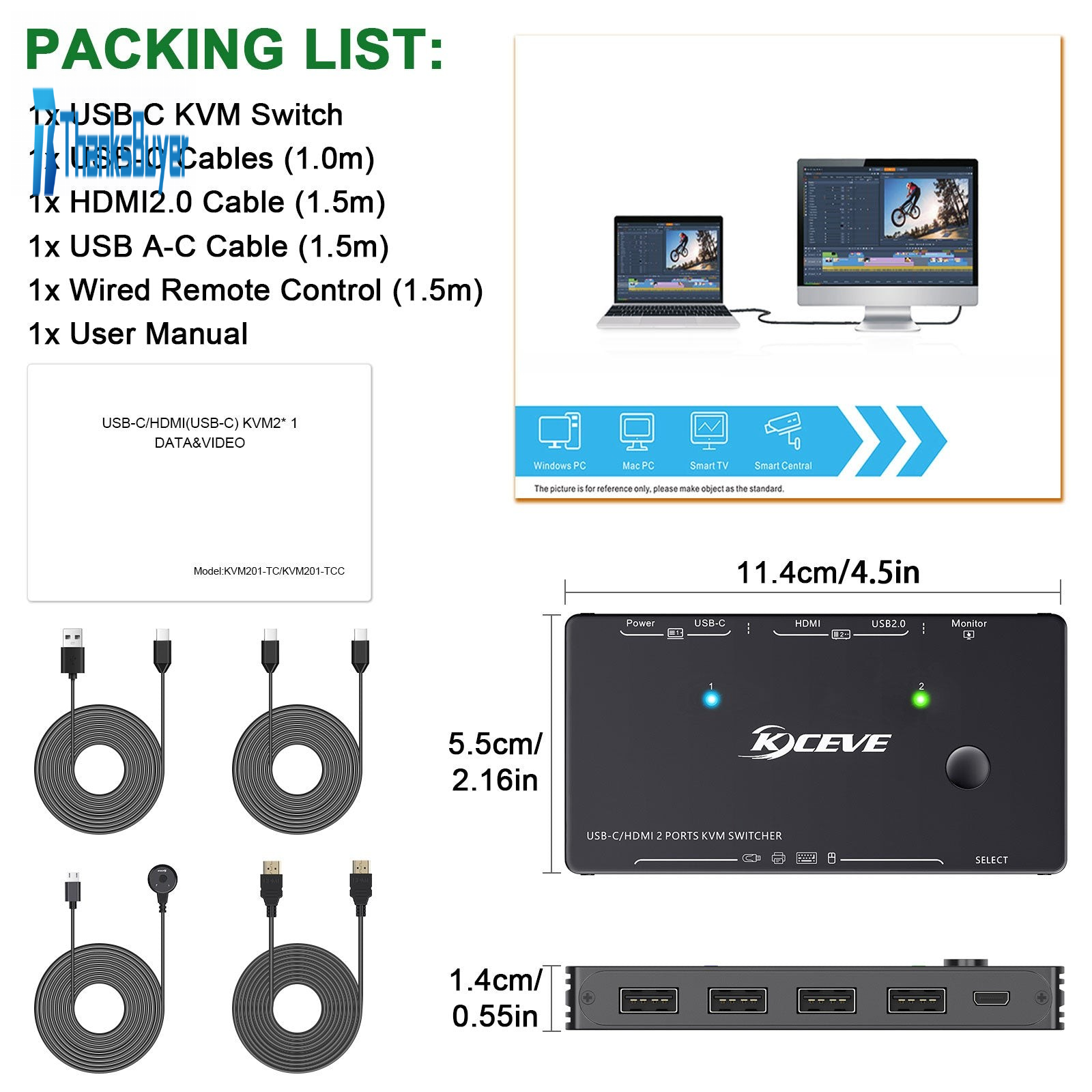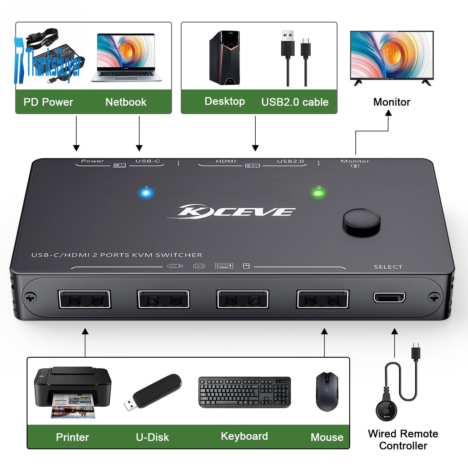KVM201TC 4K USB-C/HDMI 2 Port KVM Switch HDMI KVM Switch for U Disk Keyboard Monitor Mouse Printer