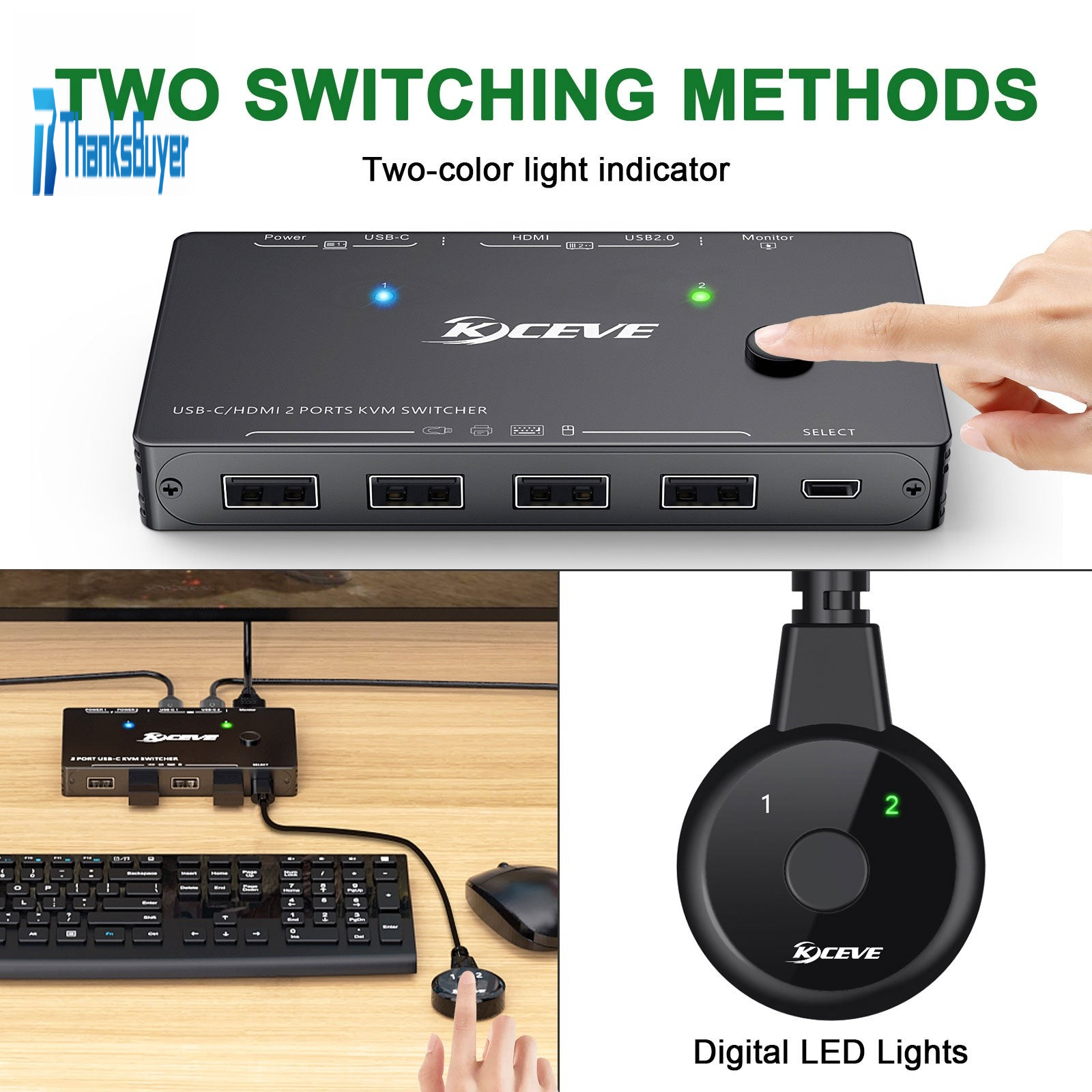 USB-C/HDMI 2 port KVM switch helps you to freely switch between 2 groups of high definition video resource and USB interface. With adaptive EDID, the equipment has excellent image processing and transmission capabilities, making the output signal smoother and more stable. It's a reliable and high performance USB-C HDMI KVM switch. Suitable for offices, computer rooms and monitoring rooms, etc.